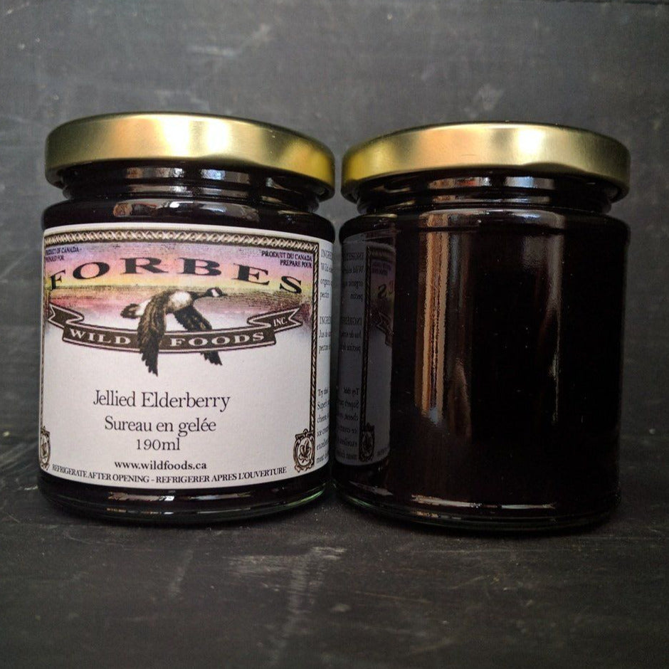 Elderberry Jelly (sambucus nigra) is made from the juice of the blue-black berries of the wild elderberry plants that grow in near-marshy ground in many areas of Eastern Canada. Elderberry jelly has been a favourite for a long time. It has a distinctive taste and is used as a condiment for meats as well as a flavouring in gravies and sauces. For a big flavour hit, use it on freshly baked bread or toast.