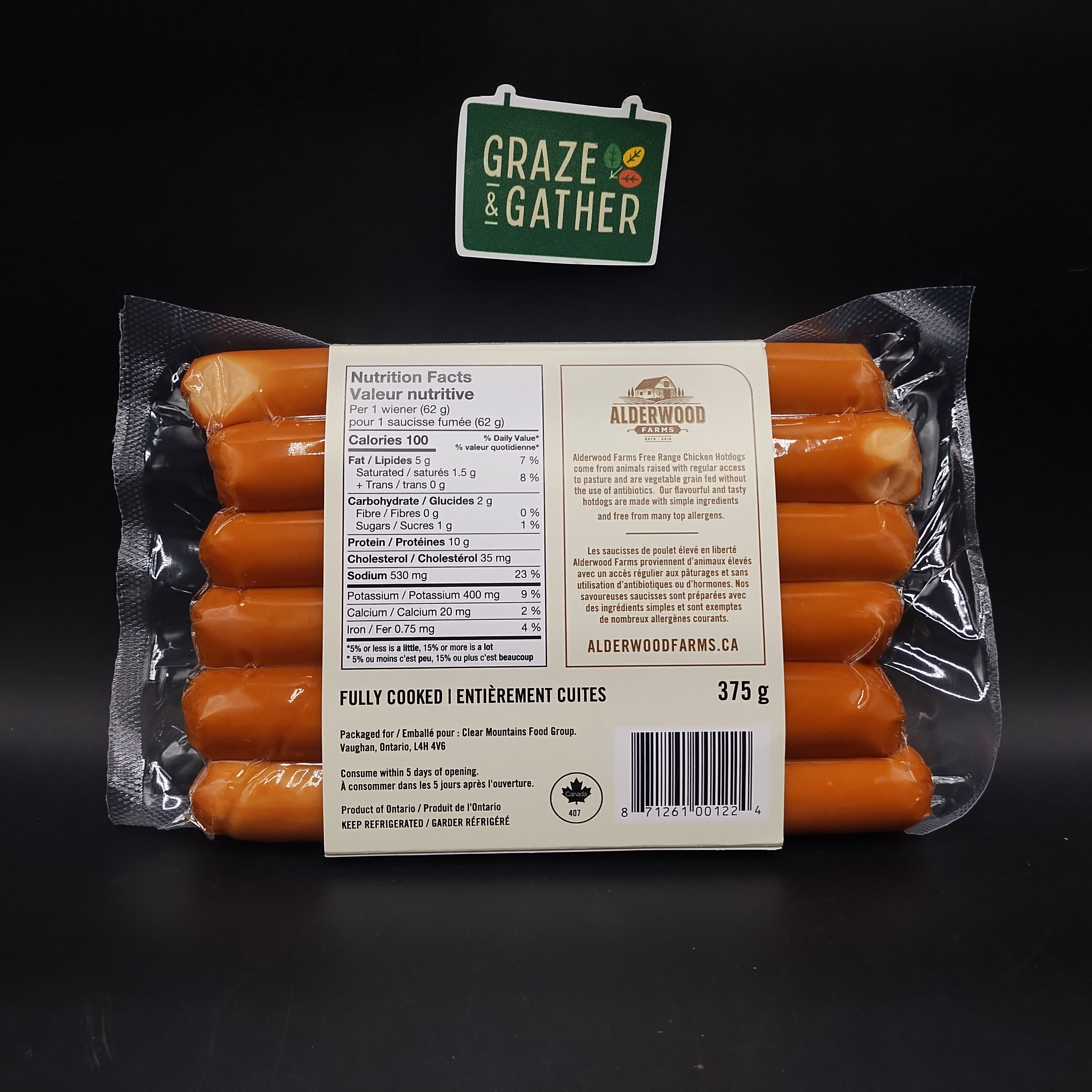Our hotdogs are high-quality, grass-fed, gluten free, and peanut free. There are no fillers, no added hormones, and all animals are raised without antibiotics. They are proudly produced in a family owned facility in Northern Ontario, with all the values you'd expect -- taking a high quality and delicious approach to one of the best parts of Canadian summers -- hotdogs. Enjoy Alderwood Farms Hotdogs grilled or over a campfire!