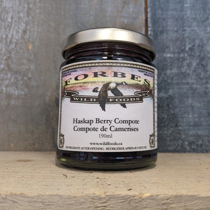 Haskap is the berry of the blue honeysuckle plant aka Lonicera caerulea. While there are many North American honeysuckle varieties, very few are edible and edible varieties are considered at risk or endangered. Blue honeysuckle is a varietal with origins in Northern Siberia and Japan where it was named "Many fruits on branches" and as such is not a true Canadian wild food. However, much of Canada is ideal for growing Haskap and as a result it is slowly being picked up by berry farmers the country over. Its blueberry, grape, raspberry-like flavour is stunning, especially if picked in dry weather, as ours are.
