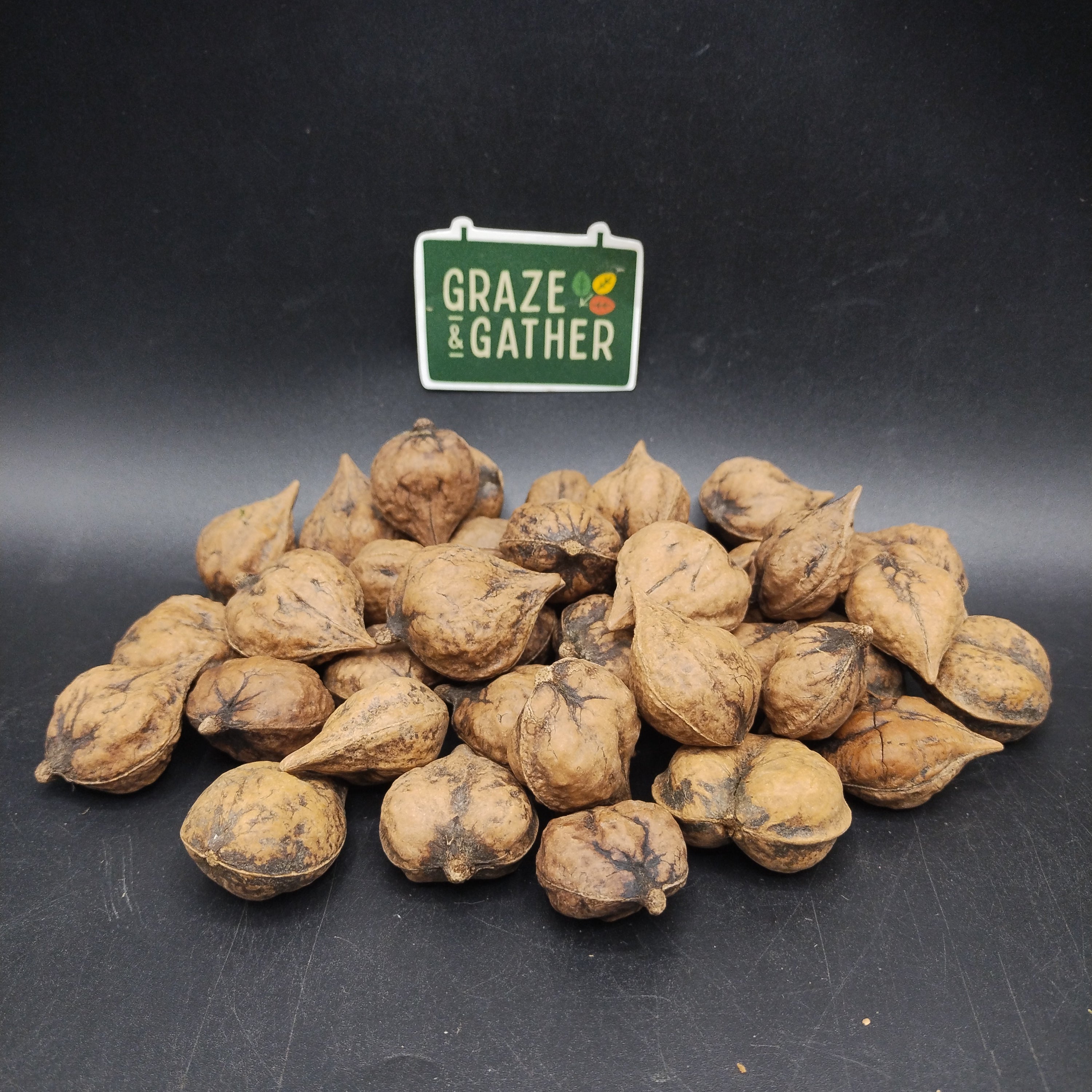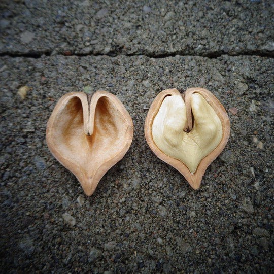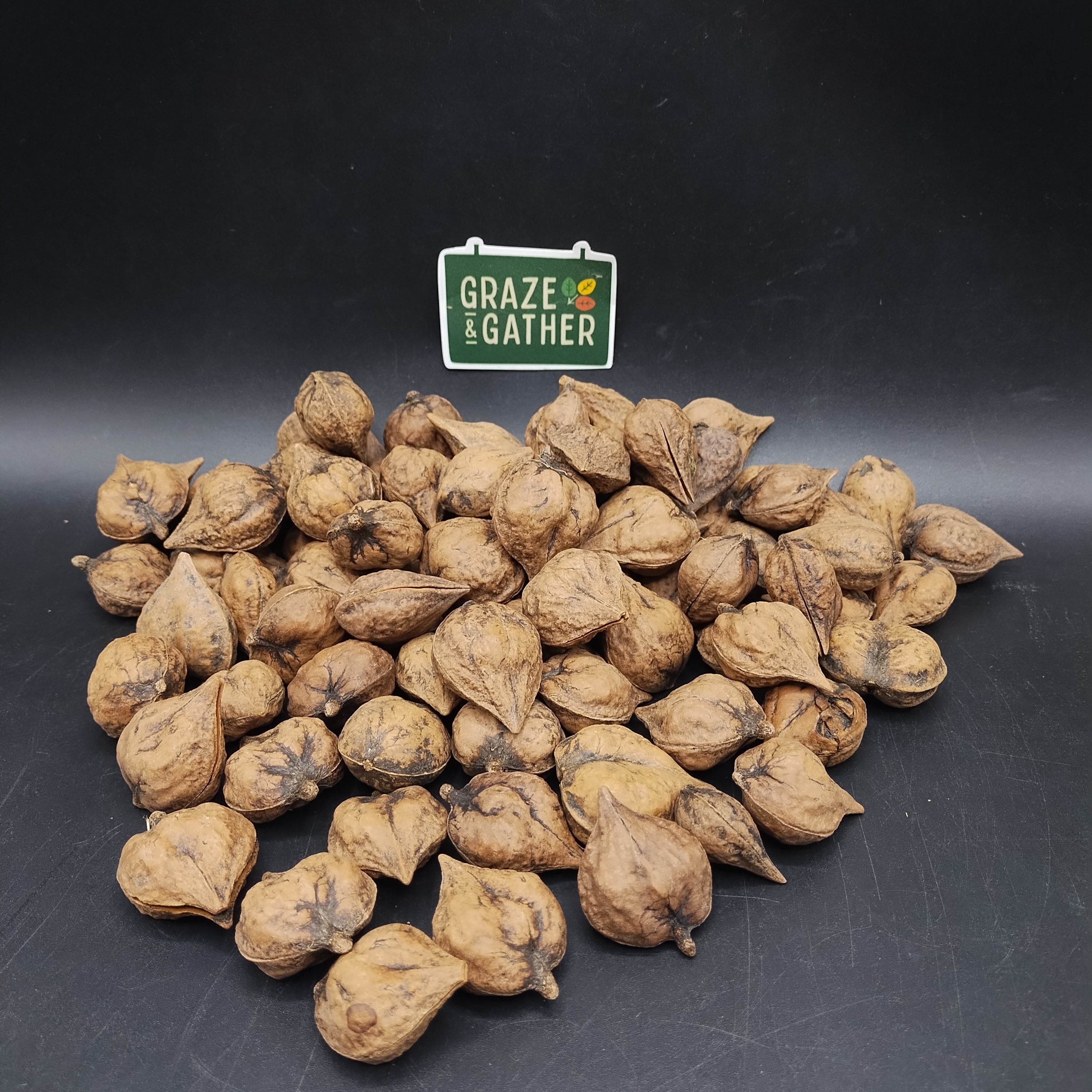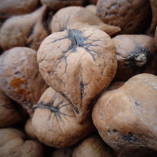 The amazing heartnut (Juglans ailantifolia) is a wonderfully buttery, creamy Japanese variety of the usual egg-shaped walnut. Heartnuts are relatively new to North America, but they grow well here, store well for months, and their little, flattened heart-shape shells make them hard to resist. The are an excellent choice for an unusual Valentine's Day gift. Hit the nuts on their edge and they open like a locket. Their shells make a great crafting material, but we carry heartnuts because their kernels taste great both raw and cooked in place of regular walnuts.