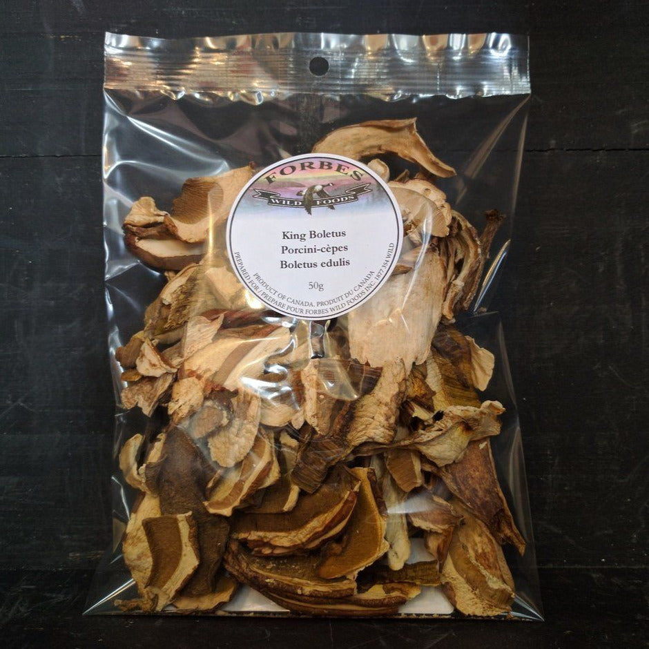 The King Boletus is perhaps the best known wild mushroom (aka Porcini, Ceps, Edulis Boletus, Steinpilz, Herrenpilz, eekhoorntjesbrood, prawdziwek, boletus chippewaensis) and is particularly revered throughout europe, where it is considered a staple in many kitchens. These mushrooms, known as the edulis clade, lend themselves to a wide variety of dishes, from stuffed meats to rich sauces to vegan dishes that require a meaty umami flavour only king boletes can provide. They pair well with duck, beef, game, dairy and shellfish and are a staple in many vegetarian dishes. As the king of mushrooms it is very flavourful: it can be eaten raw or cooked, and many people swear that the flavours become intensified in the drying process. In Ontario and Quebec, where the majority of our king boletes come from, the primary member of the boletus edulis clade is Boletus chippewaensis, a strong great tasting porcini identifiable by the reticulation on the stem and a slightly dimpled brick coloured cap that breaks a yellower shade of orange on its edge, often with white spongy pore surface when young, yellowing with age, and eventually turning olive when dried or bruised. Buy some wild picked Canadian king boletes today and taste the superior quality of Canadian kings.