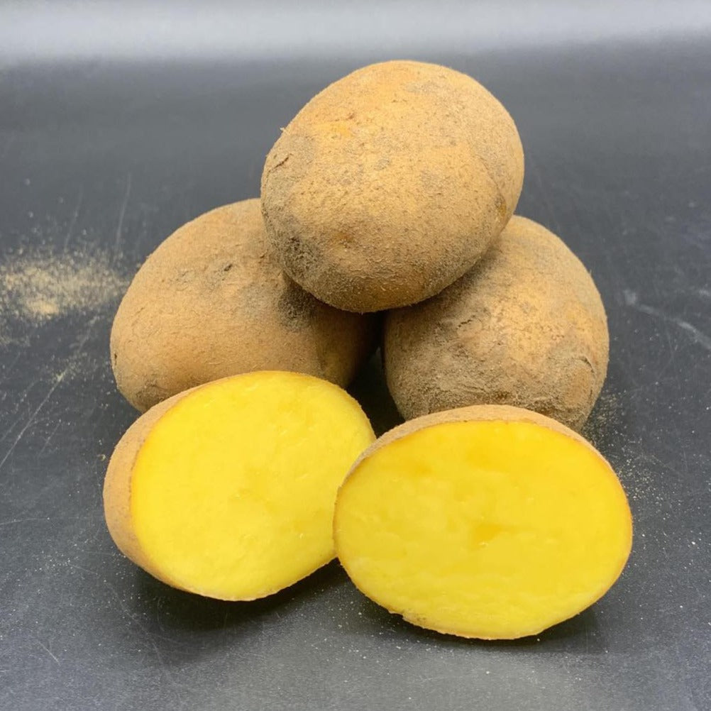 German Butterball potatoes are medium to large in size and round to oval in shape. Their texture is flaky without being dry, and has a very buttery flavour. The skin is smooth, netted, and pale yellow, and the flesh is a vibrant yellow-gold that is firm, waxy, and dense. When cooked, this gourmet variety has a creamy, tender flesh with a smooth consistency, making it a very versatile variety for steaming, baking, frying, and mashing. This American favourite doesn't require much additional flavouring or seasoning for a tasty dish.
