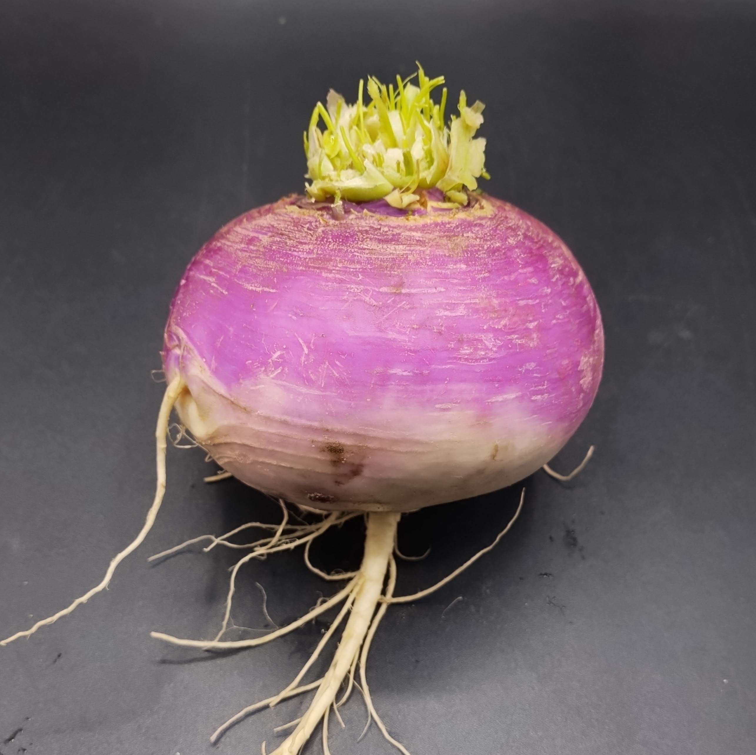 Purple Top White Globe Turnips are a large, round turnip with, you guessed it, a purple top and white bottom. The purple top is the portion of the turnip that grew above the ground, and the white is the part that grew in the ground. They have a white, hard flesh and thick skin and a mild, sweet flavour that does not lessen as they mature and grow larger than other turnips.