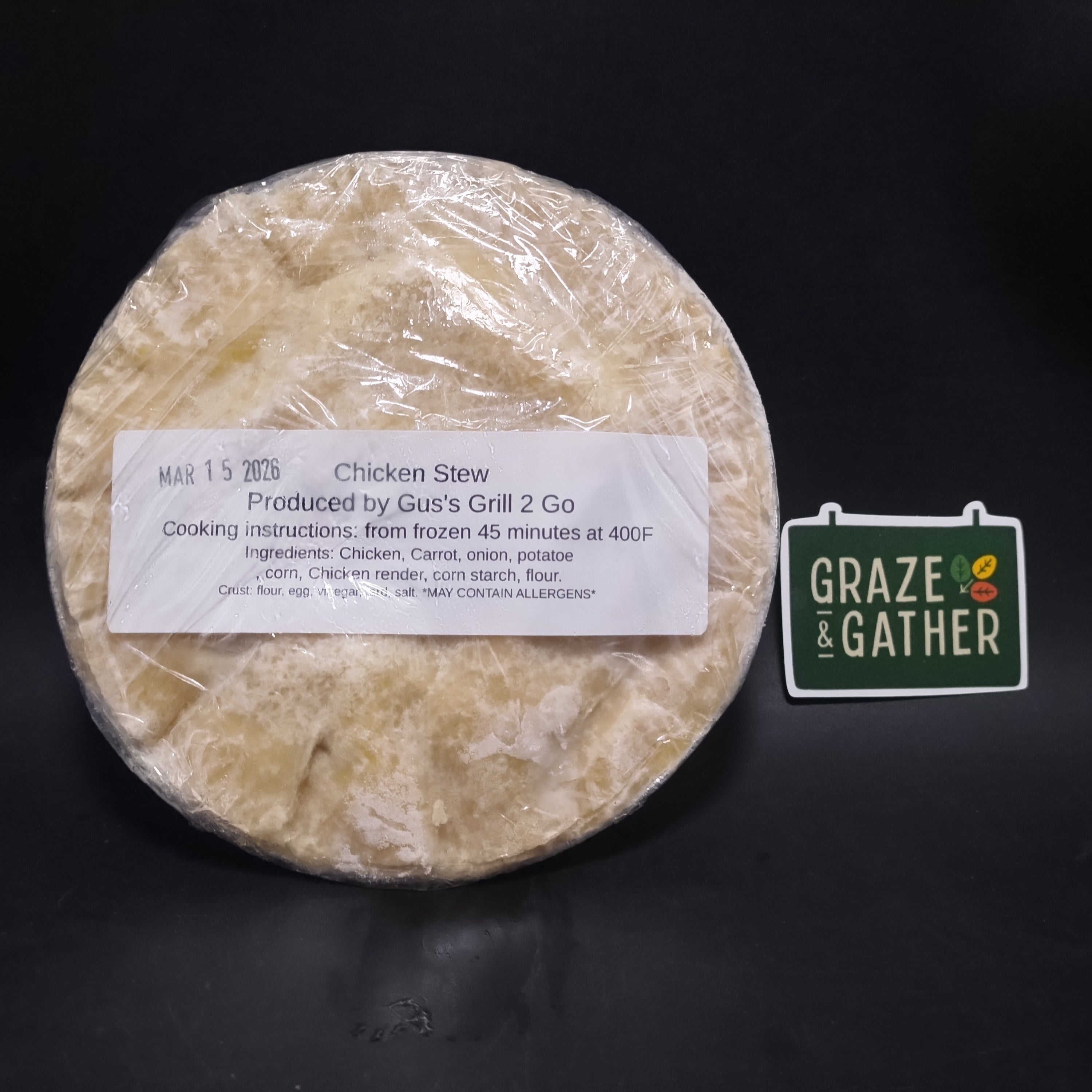 Ingredients: filling: chicken, carrot, onion, potato, corn, chicken render, cornstarch, flour.