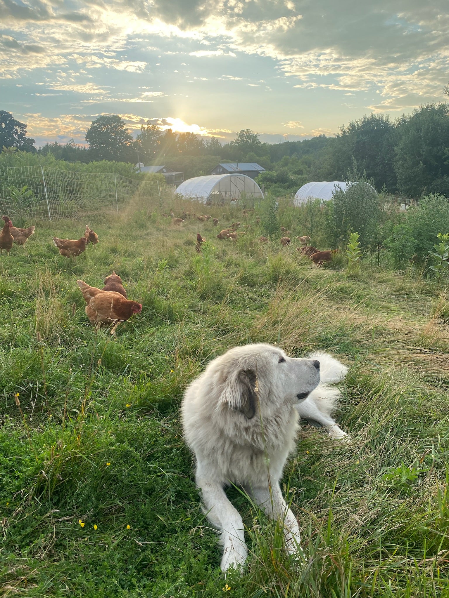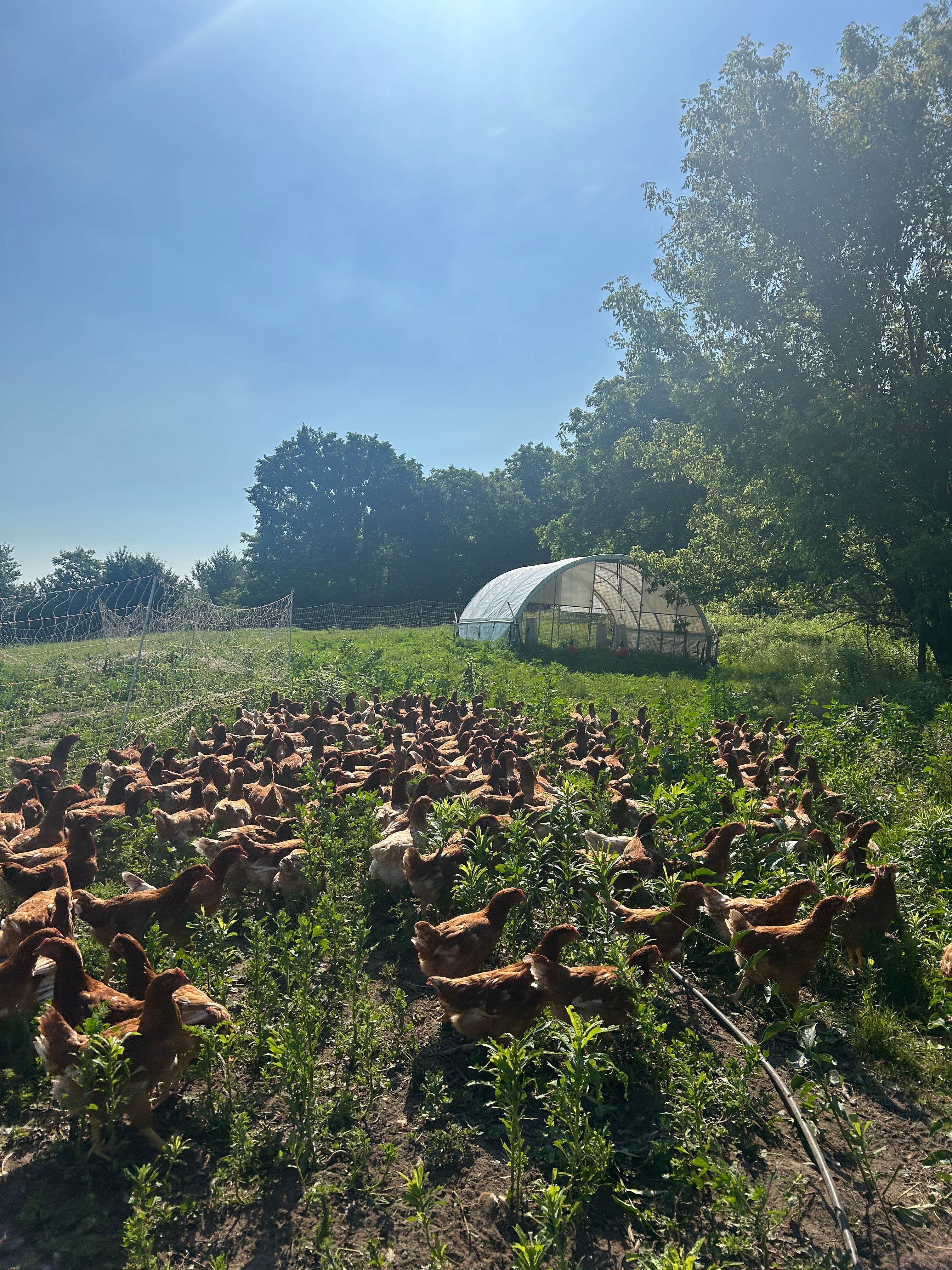 Environment: At 3-4 weeks, when they have their adult feathers, they move out of the brooder building and on to a grassy pasture. In Ontario, to call something free-range you would be allowed 54,500 birds per acre (give or take a thousand...but at that point, who is counting?). In Europe it's 400 birds per acre and in Australia it's 600. We were working with some existing pastures, and so ours are 650.