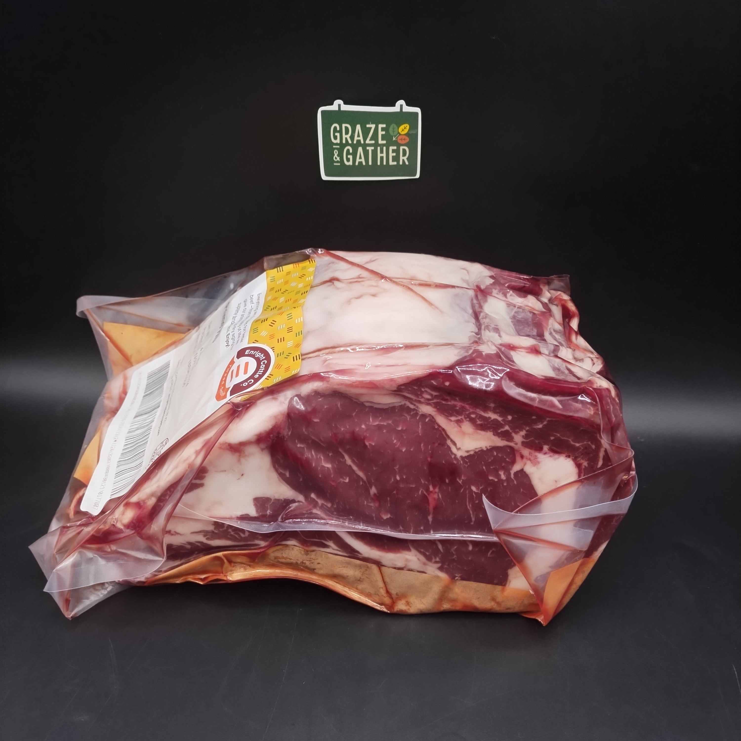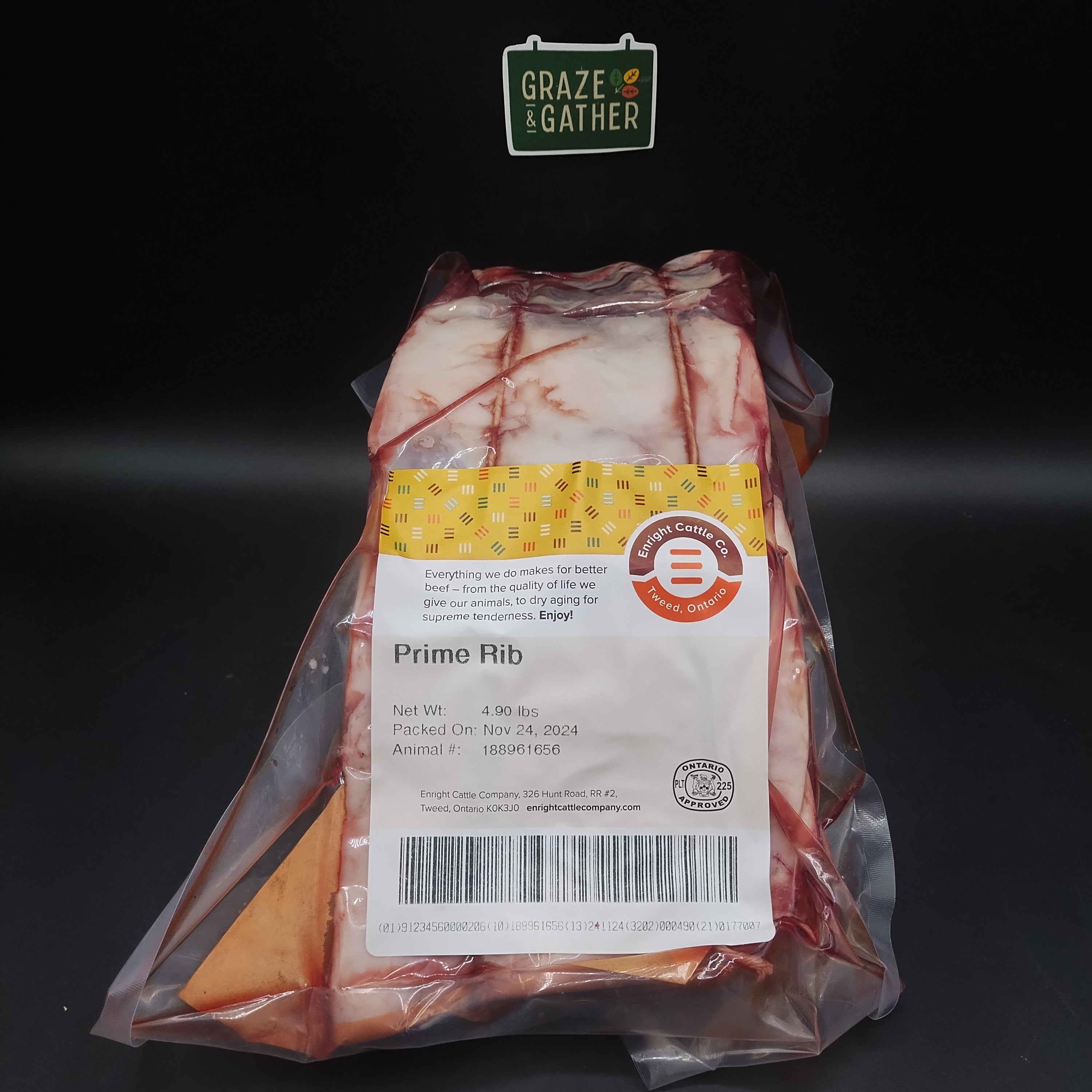 A premium oven roast, destined to impress at any occasion! The prime rib roast is cut from the rib. Season with your favourite spices and place roast fat side up if possible. Insert meat thermometer. Cover with foil or a lid. Sear roast for 10 minutes in oven at 450 F. Then reduce heat to 275 F and cook until desired doneness. Cover and let stand for at least 15 minutes before cutting.
