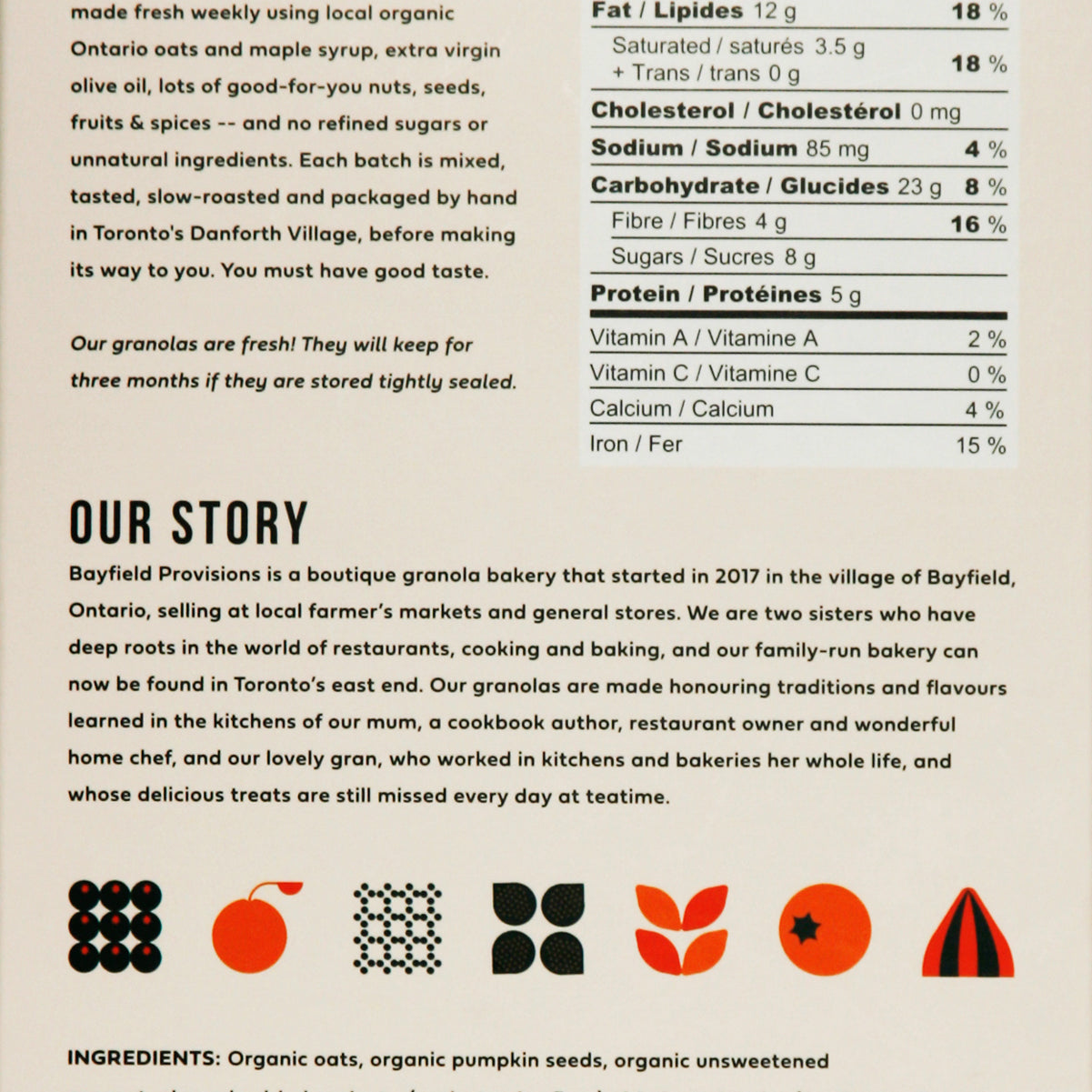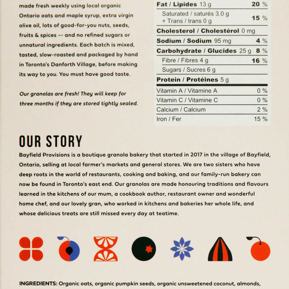 Bayfield Provisions is a boutique granola bakery that originated in the village of Bayfield, ON, but it now based in Toronto's east end. Bayfield crafts deeply flavoured small-batch granolas that are made fresh weekly, using locally grown gluten-free oats, local maple syrup, extra virgin olive oil, and lots of good-for-you nuts, seeds, and fruit.