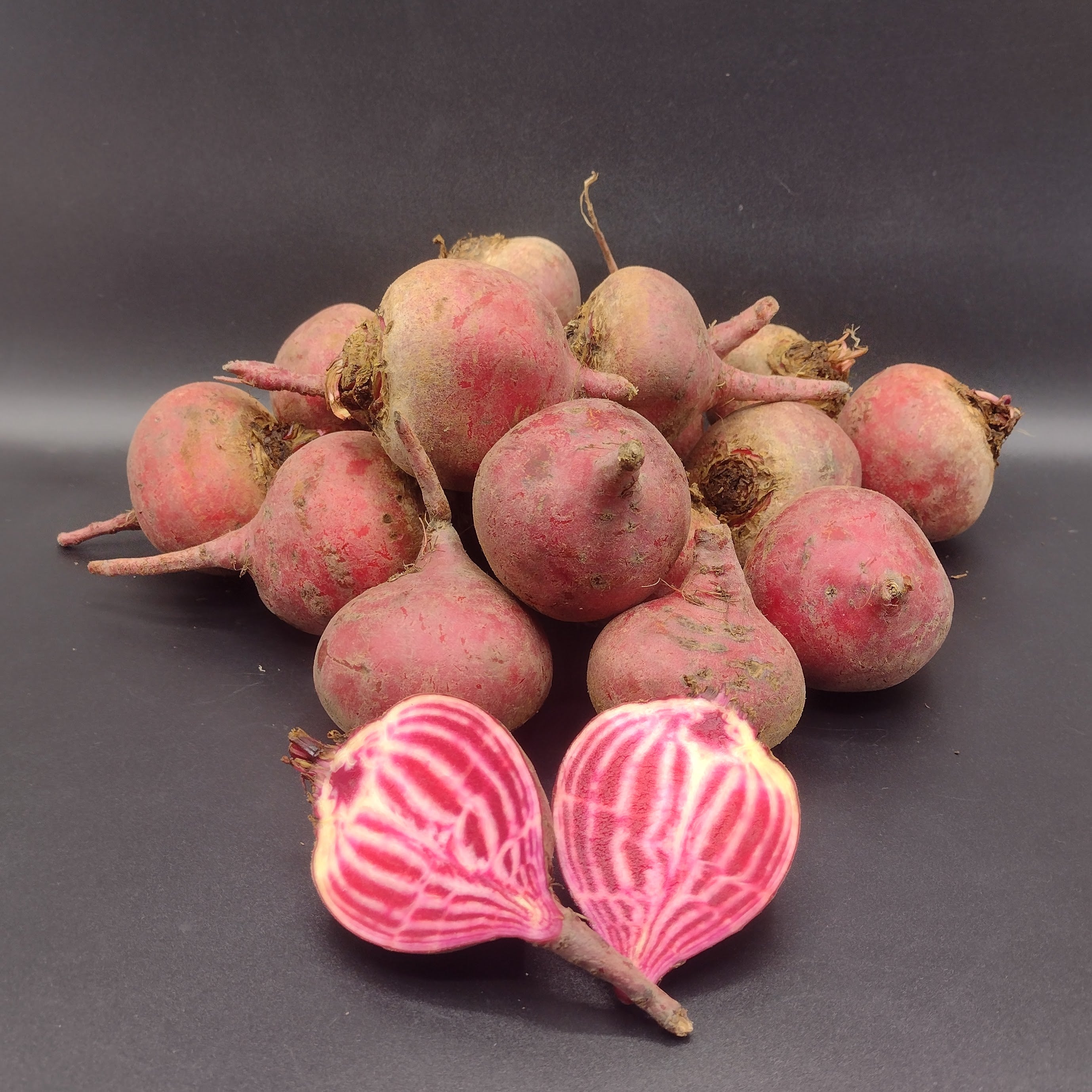 Candy cane beets are also known as Chioggia beets, and are characterized by the distinctive red and white concentric circles that radiate out of the centre of this beautiful root vegetable. Often sweeter, and less earthy than other varieties, one of the benefits of cooking with Candy Cane is that it is far less likely to stain your fingers!