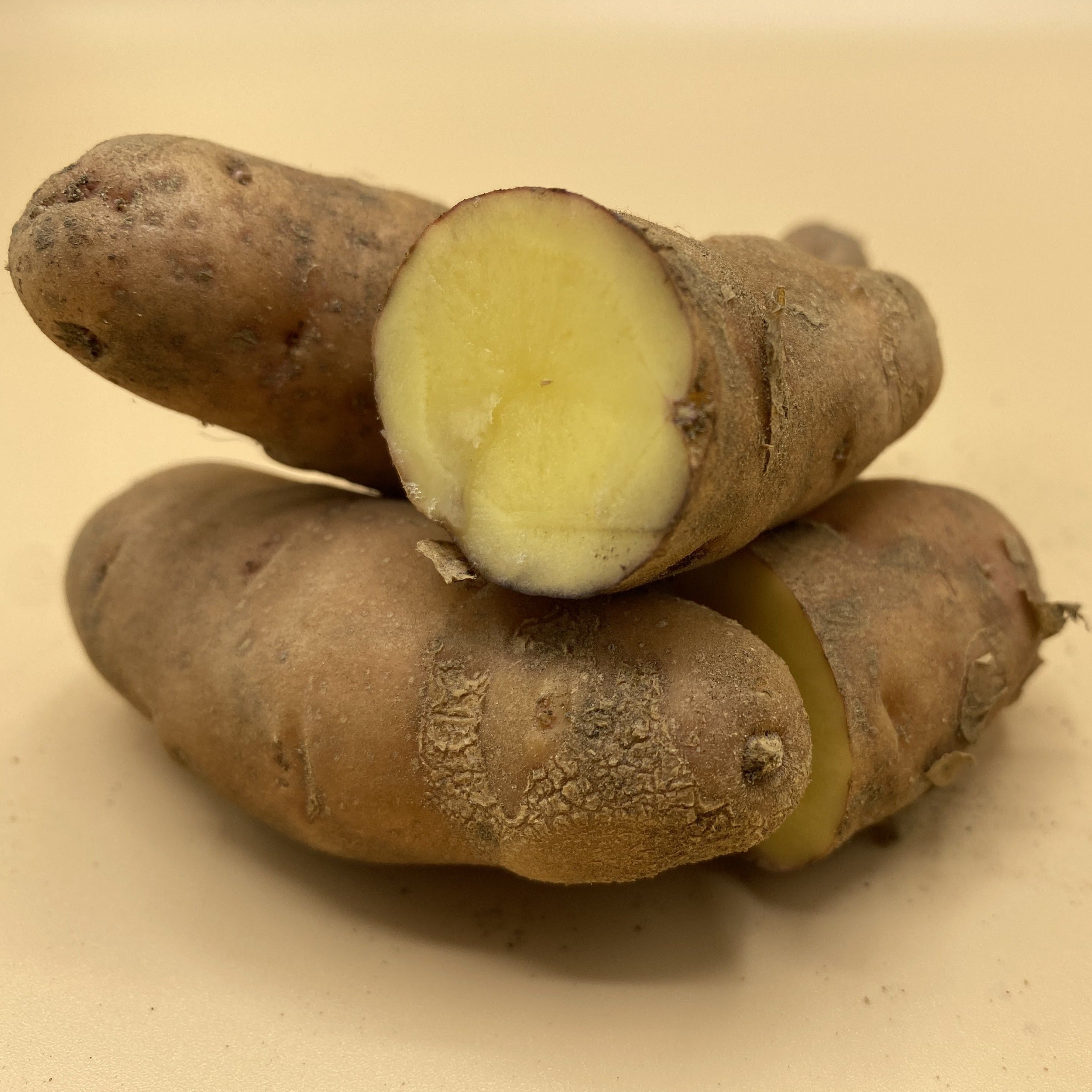 Pink Fir Apple potatoes are large, knobby, and oblong in shape with thin, smooth skin that ranges from light brown to light pink. The skin is pale yellow to gold and is creamy, waxy, firm, and dense in texture. This potato is THE salad potato, but is also good for roasting, boiling, and steaming. It retains its shape when cooked, and has a rich, earthy, and nutty flavour. Peeling this variety is tedious due to all the knobs, so it is usually cooked with the skin on, which is okay since the skin is thin.