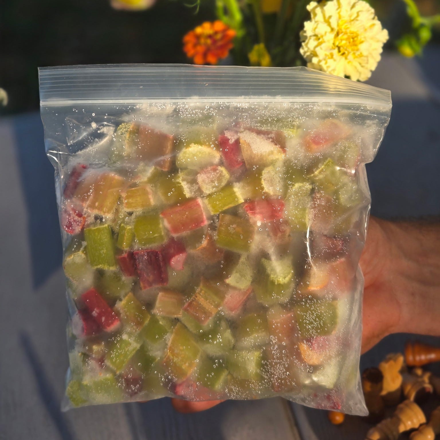 A pound of frozen rhubarb from Millbrook Orchard's 2025 growing season. Perfect for stewing, quick jams, and baked goods.