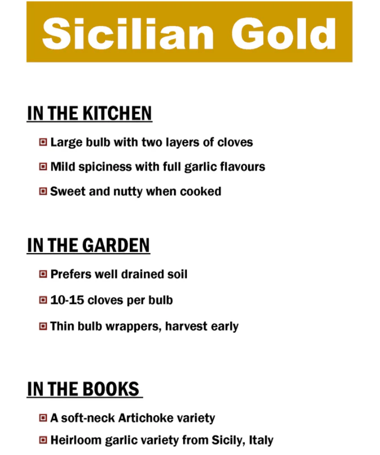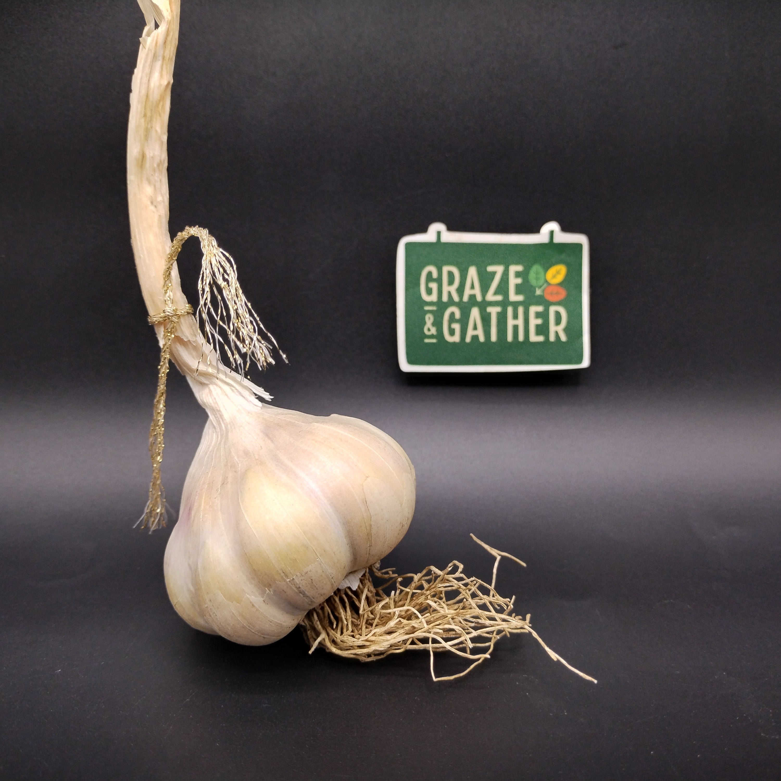 This softneck garlic has a gold string. Not only to match its name, but also for its rich golden aftertaste. It has multiple layers of small silky cloves and scores a medium on the spicy scale. Similar to the flavours of Rocambole variety Italian Purple, but much milder.