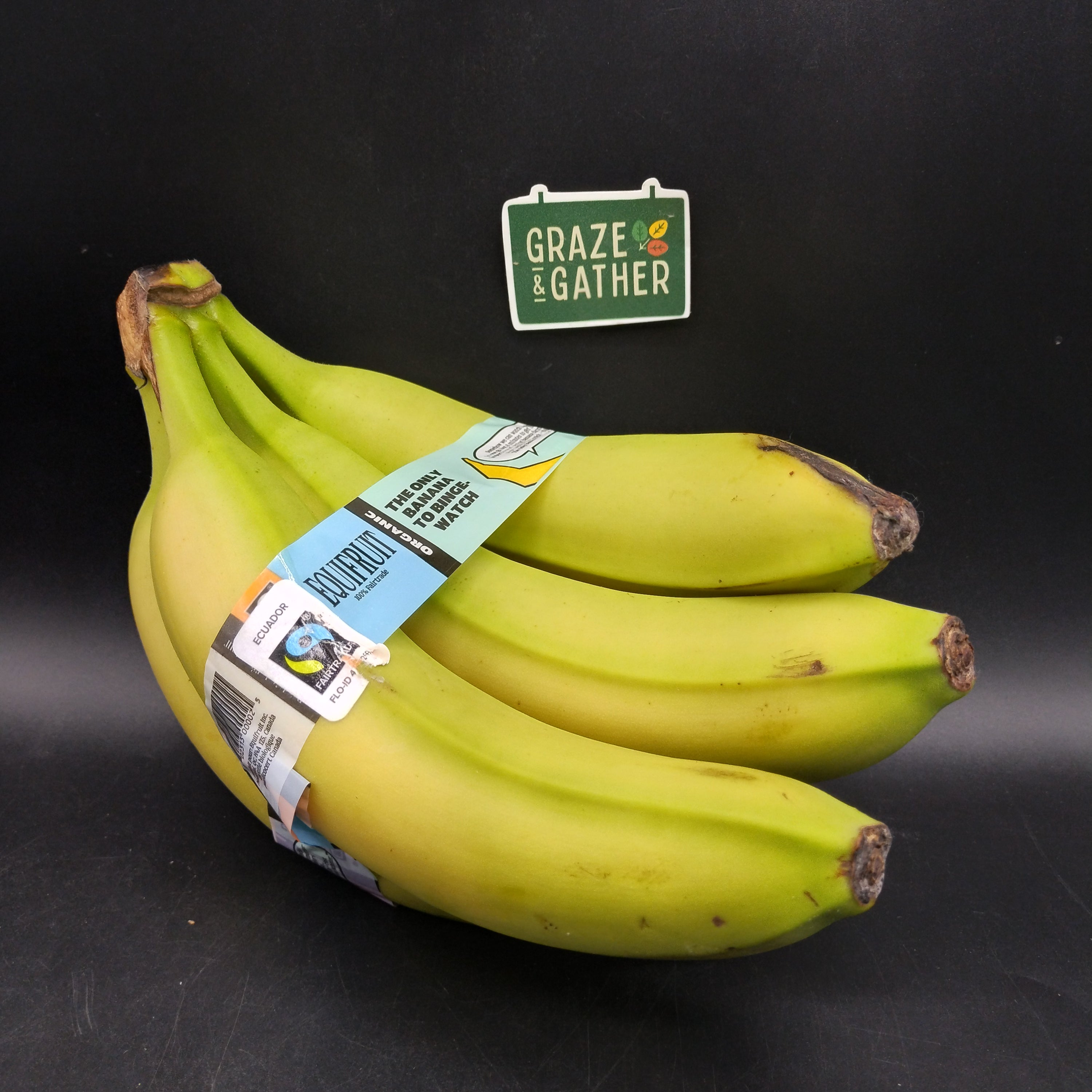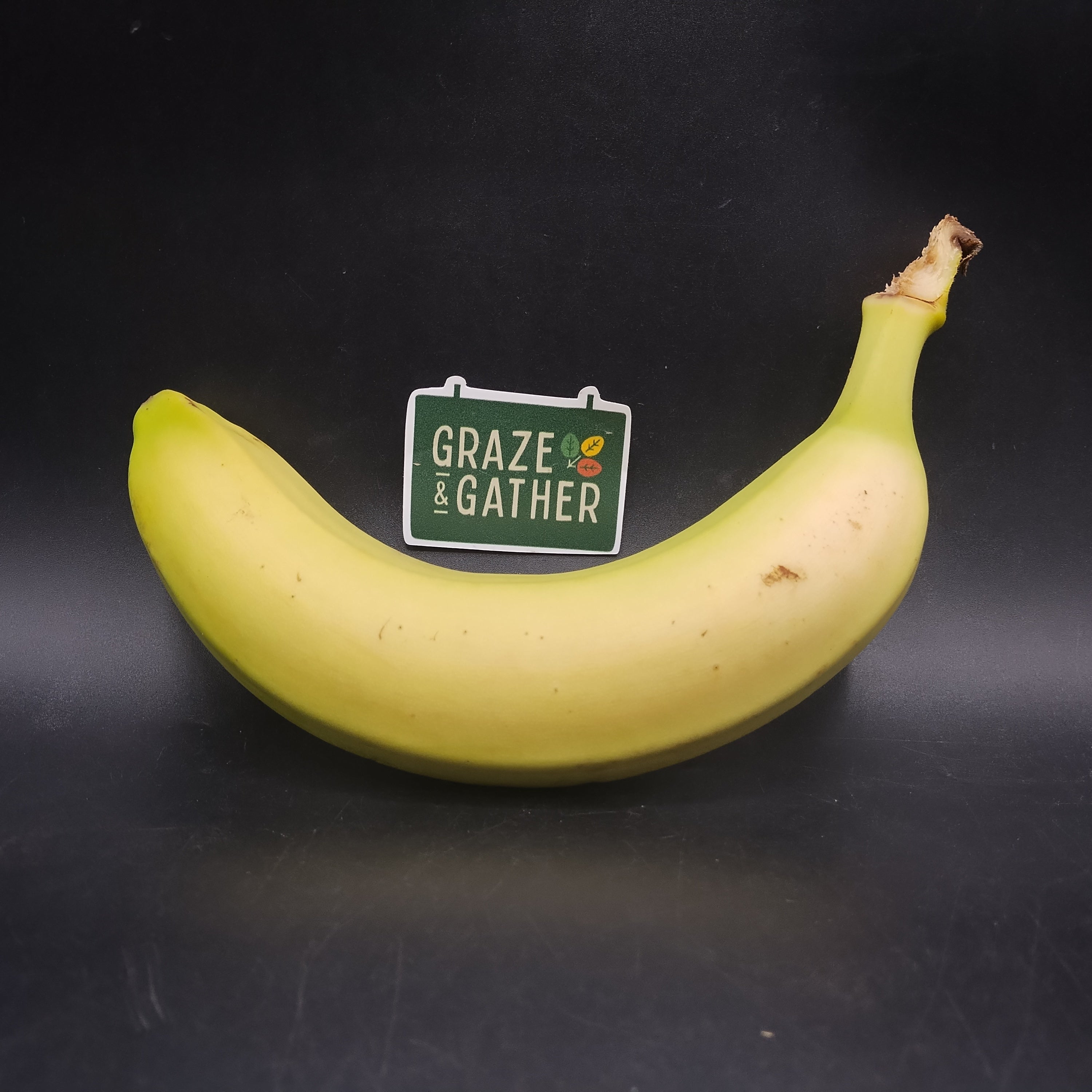 One fair trade, certified organic banana from Equifruit, a fairtrade certified, 100% women owned B-corp, based in Montreal, Canada.