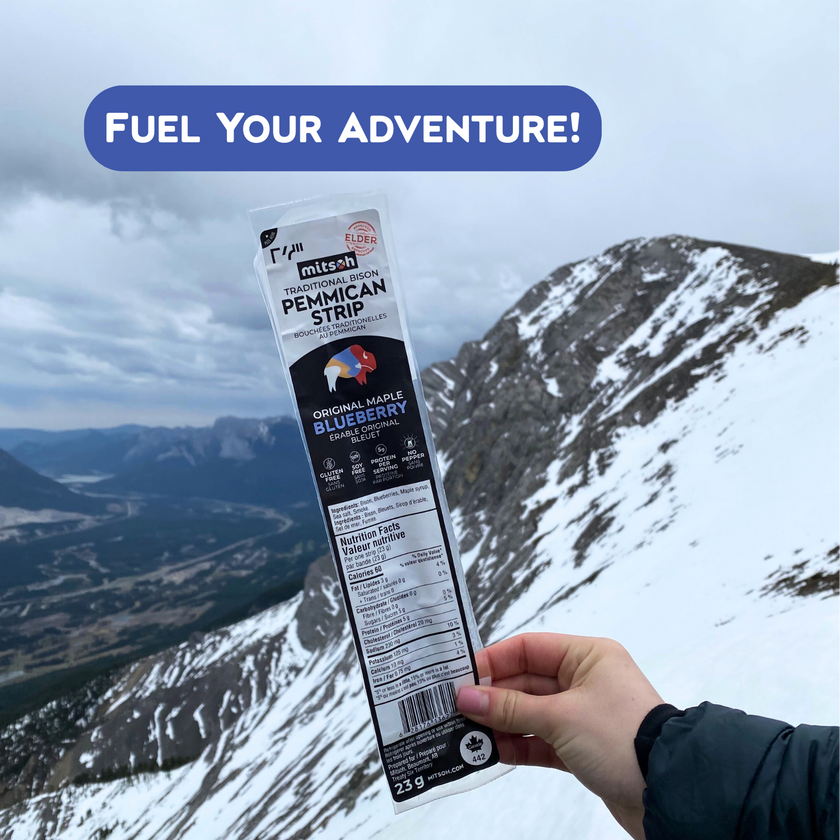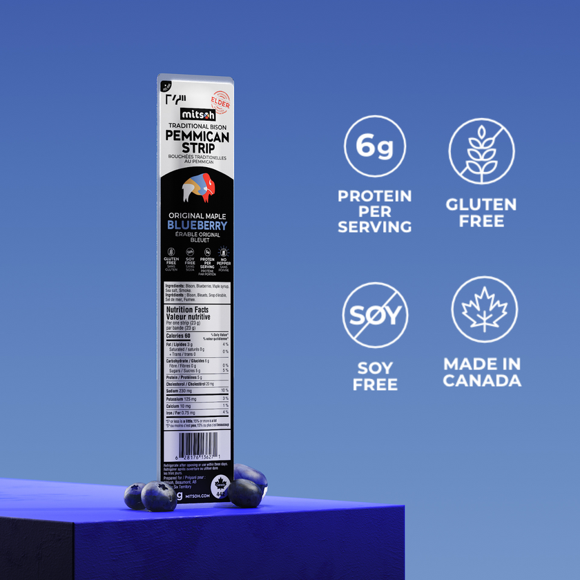 It's here!! Introducing our MITSOH BLUEBERRY PEMMICAN STRIPS without pepper! These delicious snacks are made with REAL, all-natural BISON! The whole food ingredients are simple: Bison, Blueberry, Pure Maple Syrup, Sea Salt, Smoke. That's it!