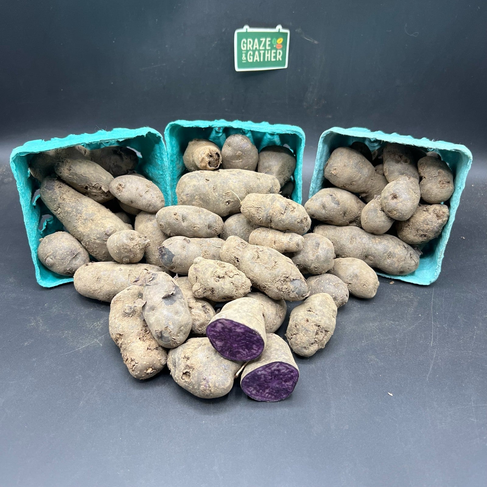 Purple Peruvian potatoes are a fingerling type with dark purple skin and dark purple dry flesh that can sometimes be marbled with white. When cooked, the flesh becomes a light bluish-purple hue and the texture becomes similar to a standard Russet potato. It has mid-range starch content, and is less starchy and moister than a Russet, with a taste that is slightly nuttier and earthier.