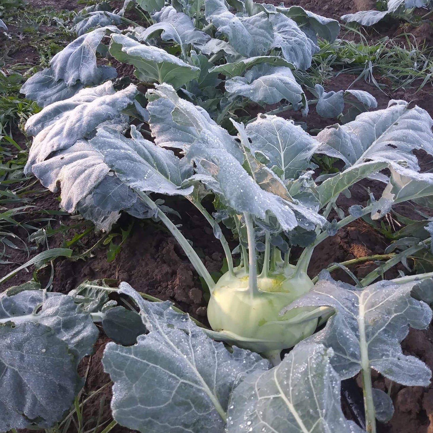 Kohlrabi is similar in taste to cabbage but sweeter, and shares its texture with turnip. Both the leaves and the bulbous stem are edible. The leaves are similar to swiss chard or kale. Kohlrabi are usually ready for harvest in Ontario from June to September, depending on the growing conditions.