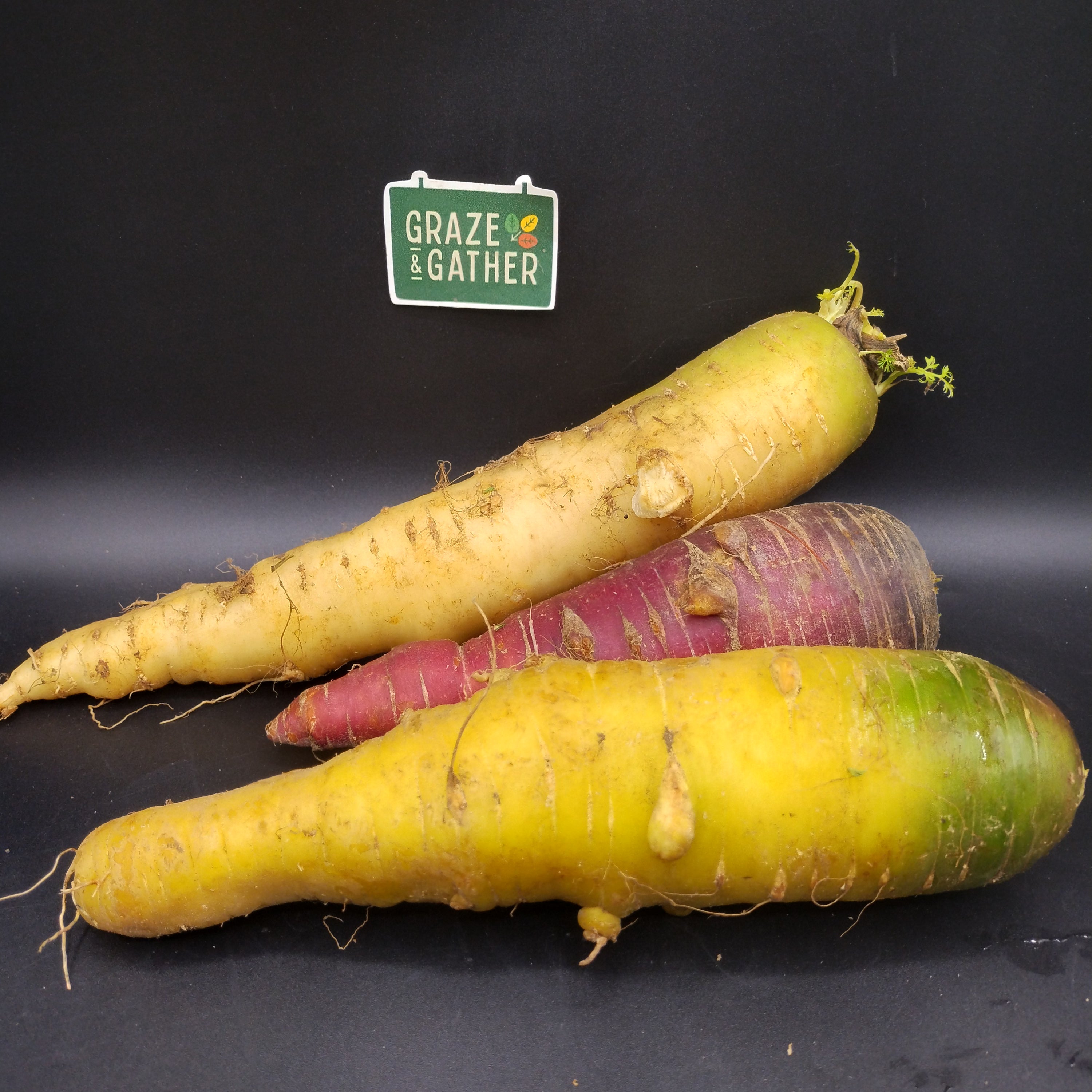 These are storage root vegetables and often a lot larger than the narrow root veg we find in the grocery stores. They are perfect for grating raw into salads and grain bowls, or for making carrot cake!