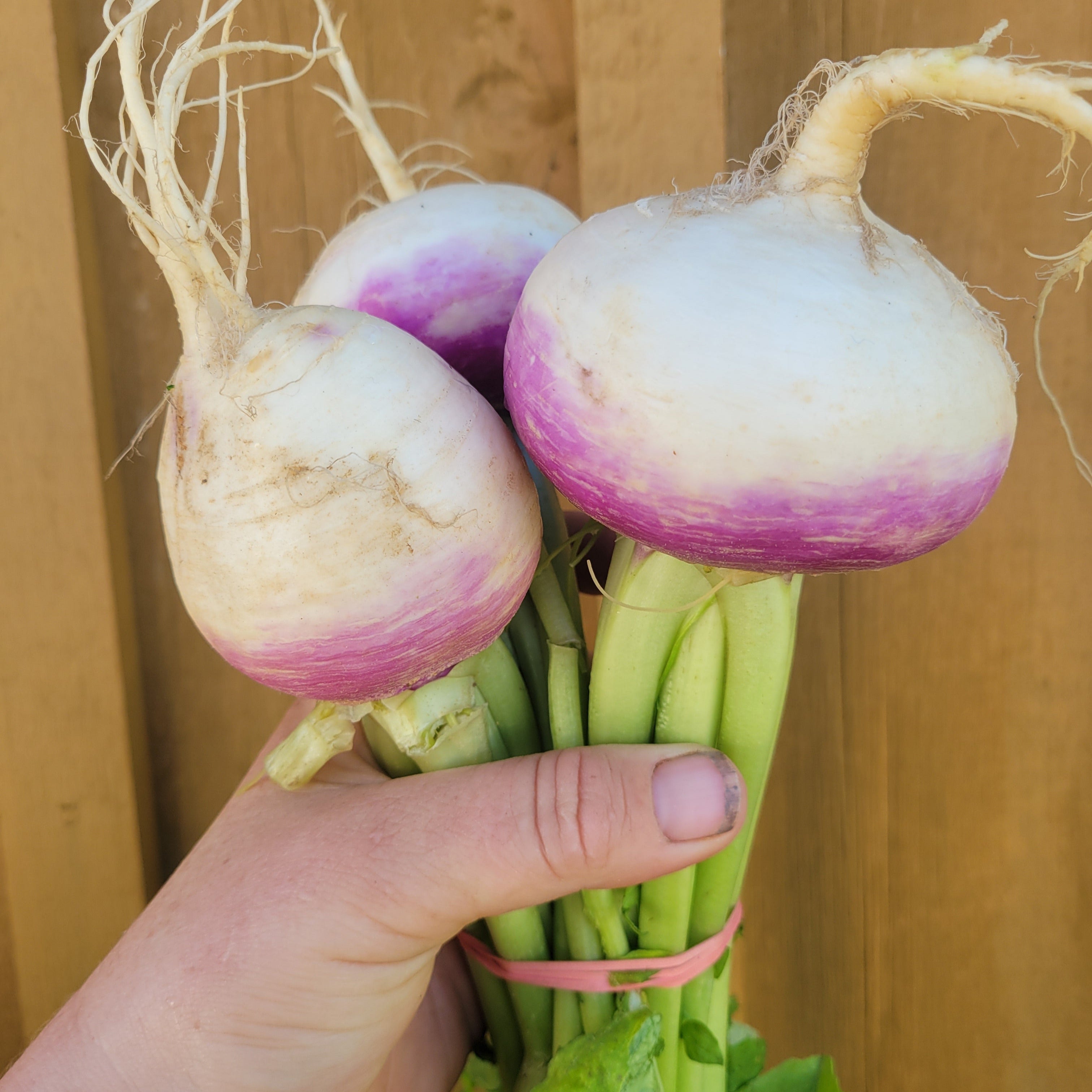 Purple Top White Globe Turnips are a large, round turnip with, you guessed it, a purple top and white bottom. The purple top is the portion of the turnip that grew above the ground, and the white is the part that grew in the ground. They have a white, hard flesh and thick skin and a mild, sweet flavour that does not lessen as they mature and grow larger than other turnips.