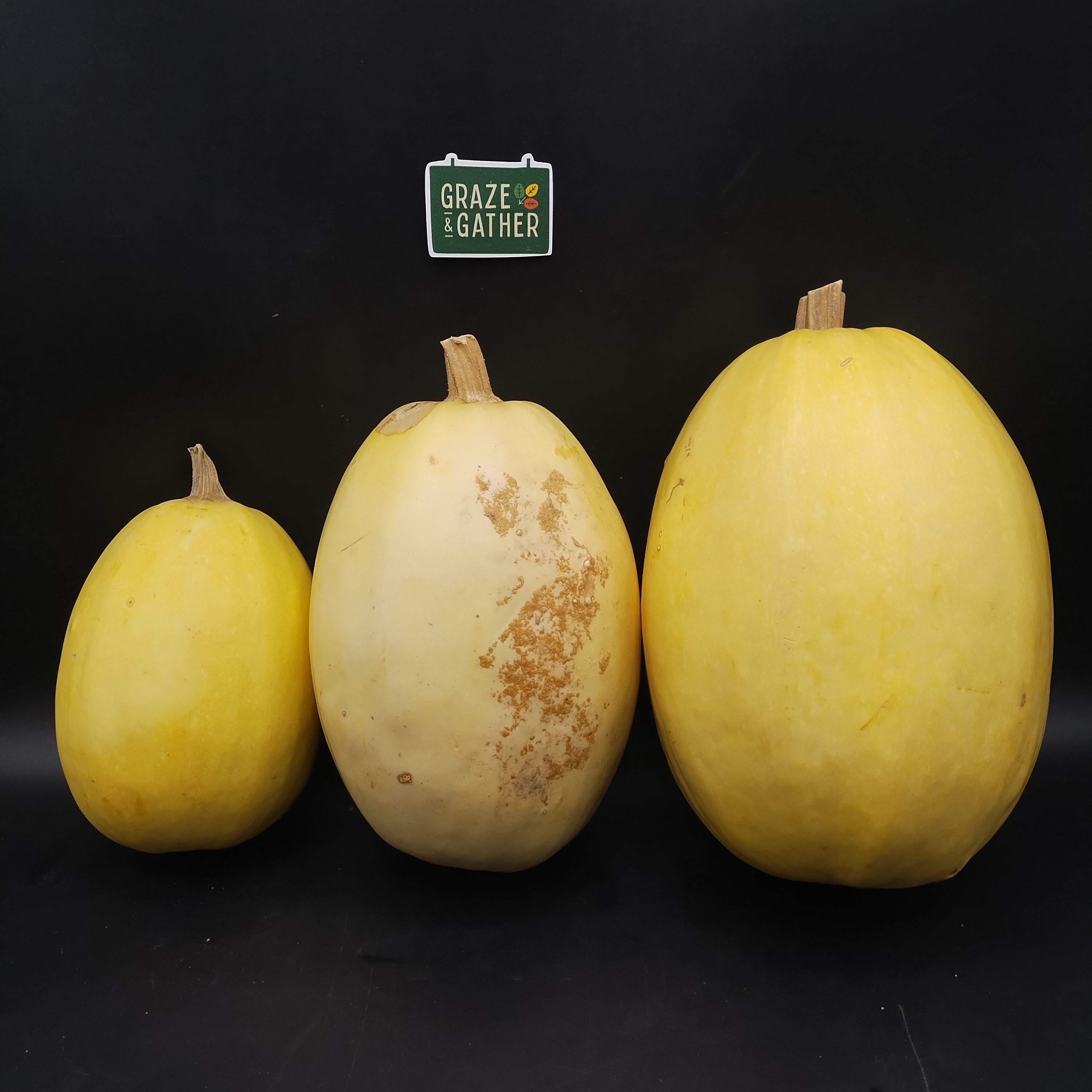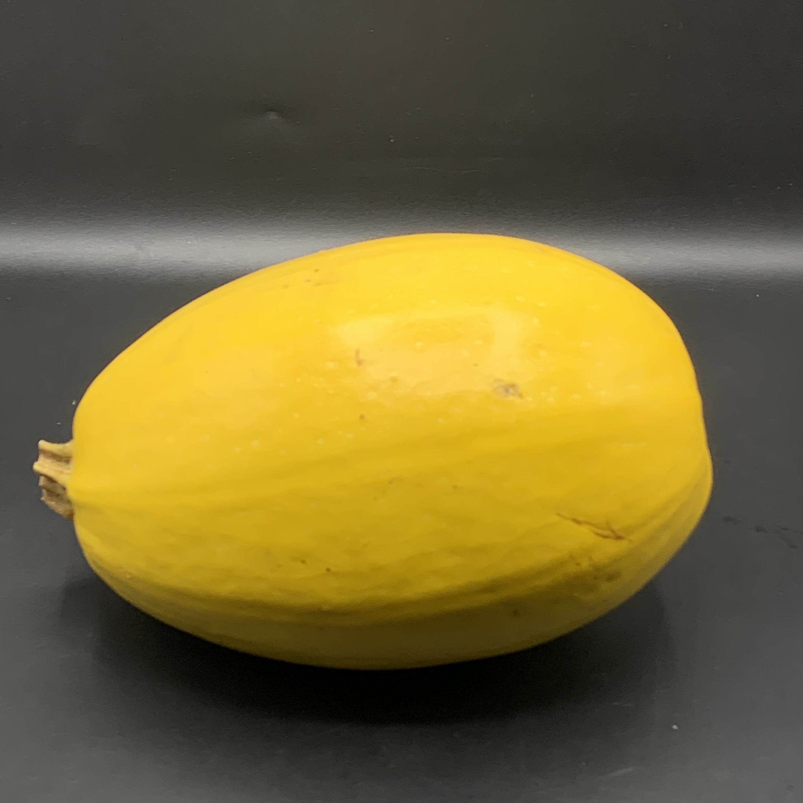Spaghetti Squash has an oval shape and yellow-coloured flesh and rind, and the flesh becomes stringy when cooked. The golden-yellow rind is smooth, hard, and thick, speckled with many cream-colored flecks and spots. Underneath the rind, the pale orange to yellow flesh is firm, moist, and crunchy when raw and encases many flat, oval seeds in a pulpy, central cavity. Spaghetti squash has a mild, sweet, and nutty flavor.
