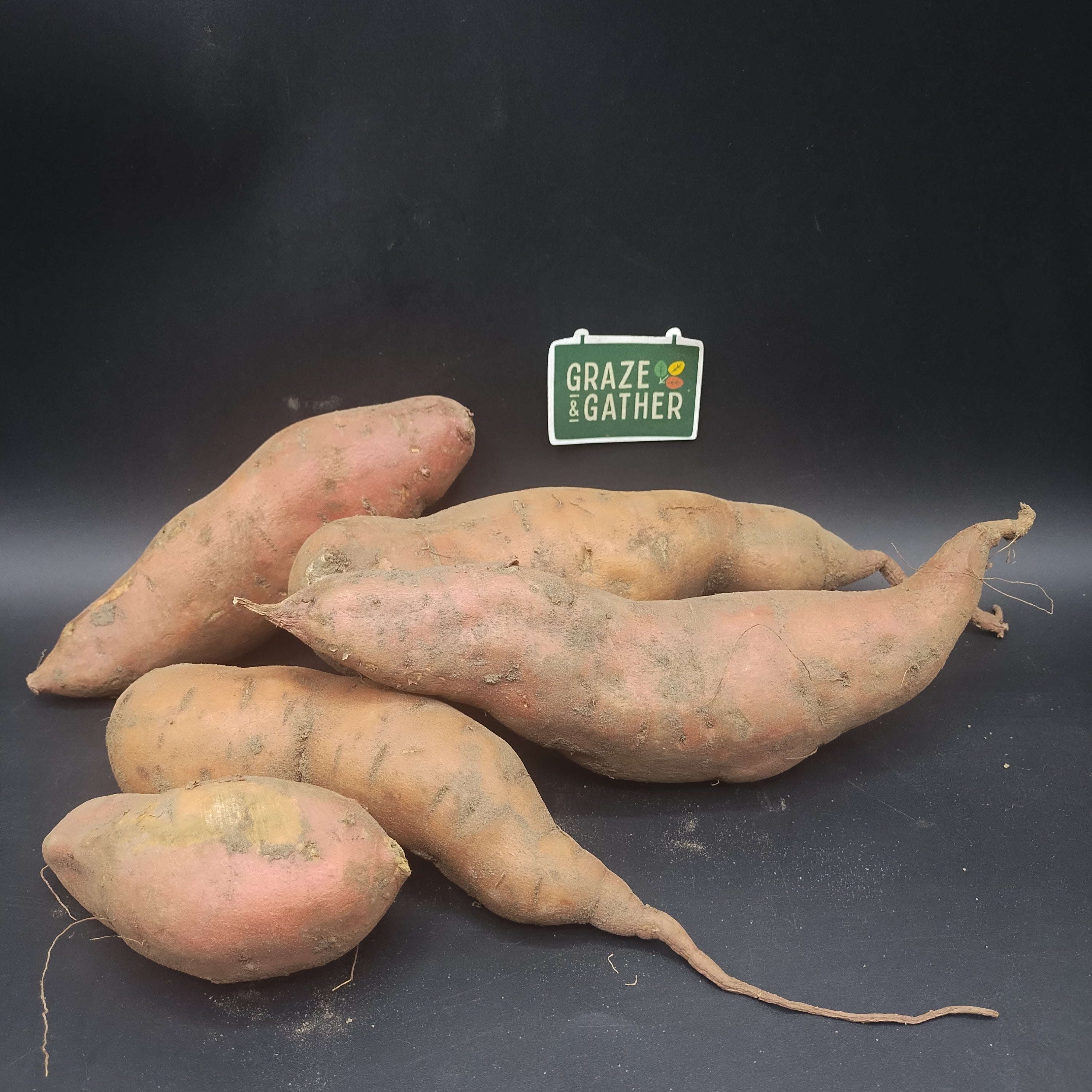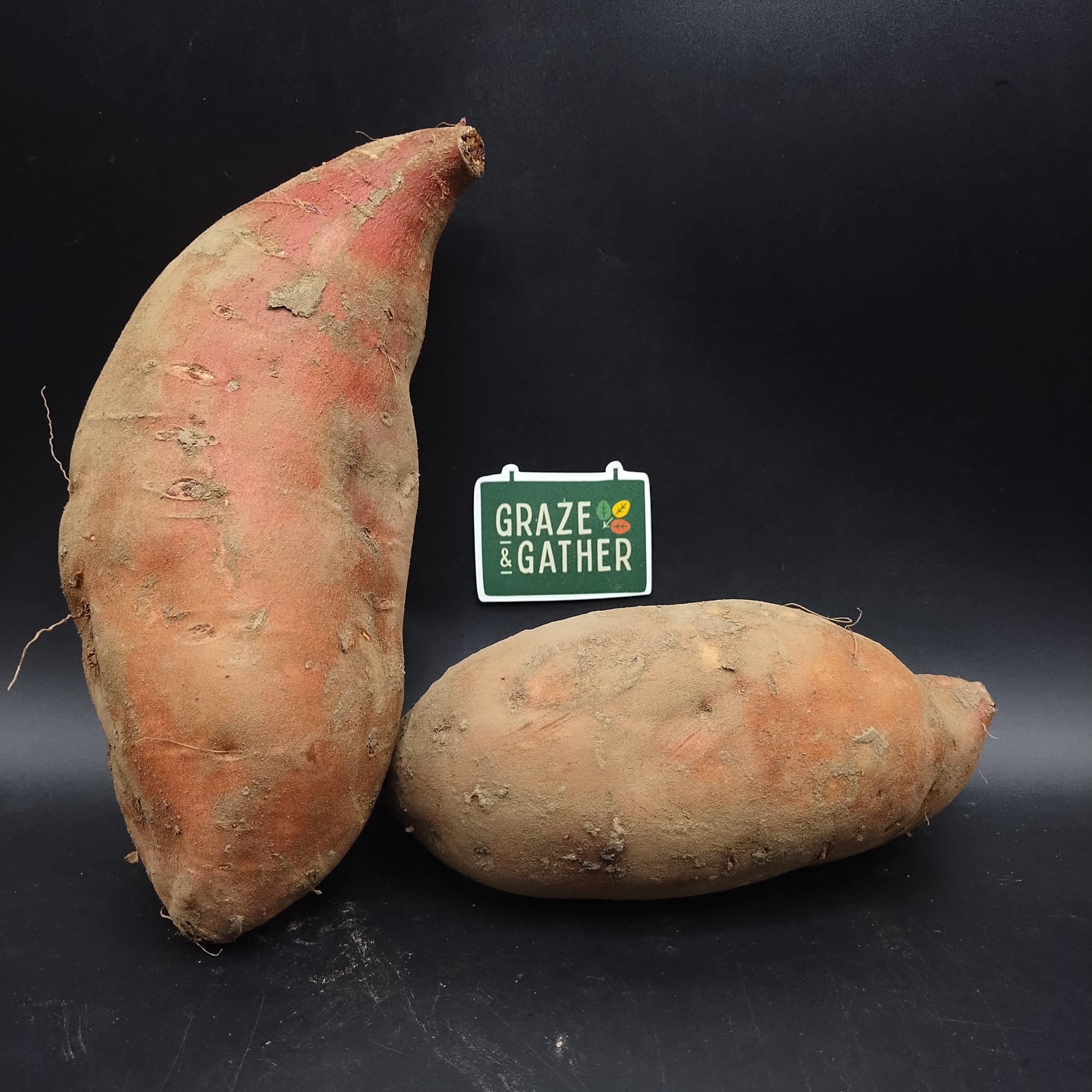 Sweet Potatoes look like elongated baking potatoes with an orange-brown smooth skin and a creamy orange flesh that turns brighter orange when cooked. They are sweeter than the average baking potato and have a more 'stringy' or fibrous texture. Sweet Potatoes are usually ready for harvest in early fall in Ontario, and can be stored into the off-season months in the fridge or a cool, dry place, or cubed and frozen.