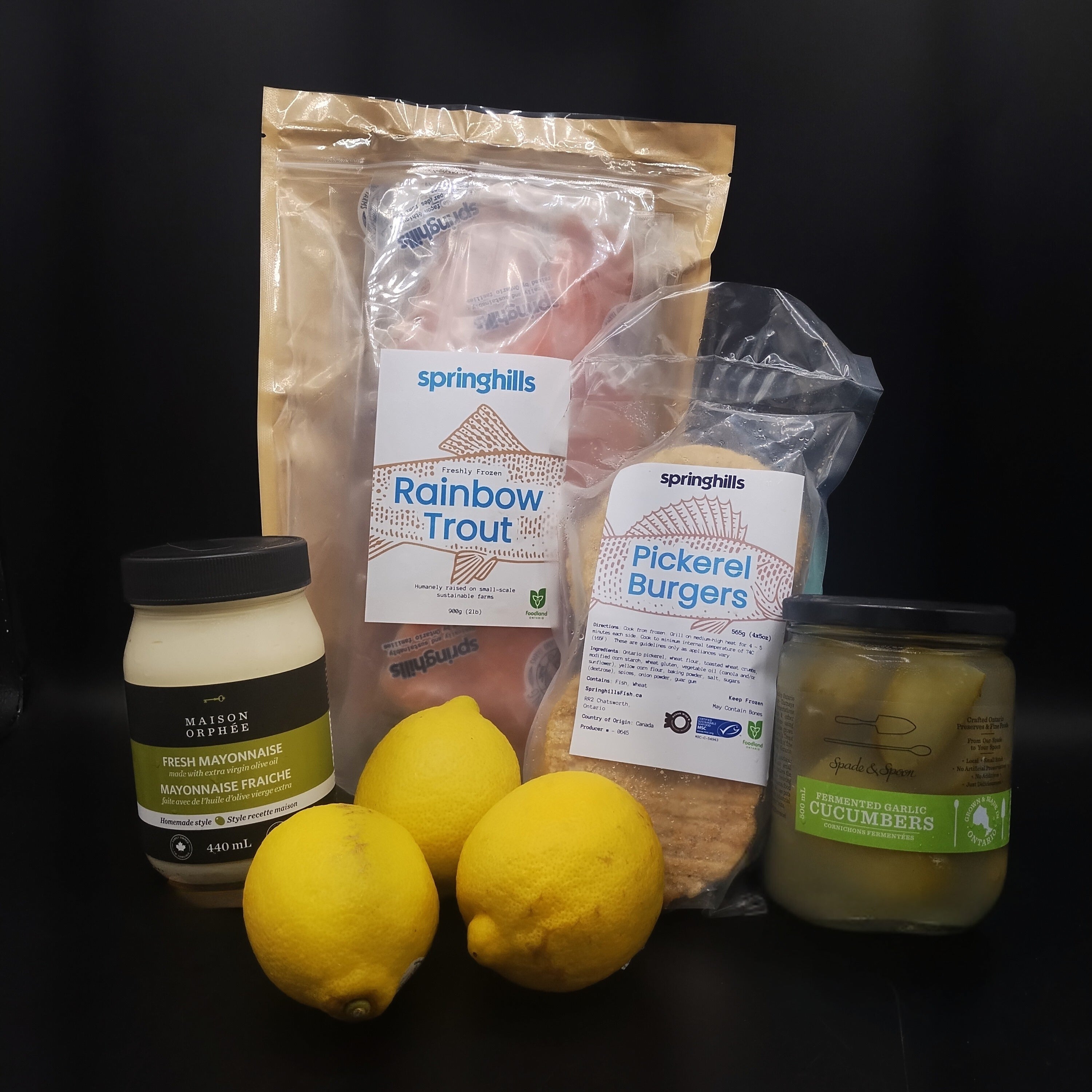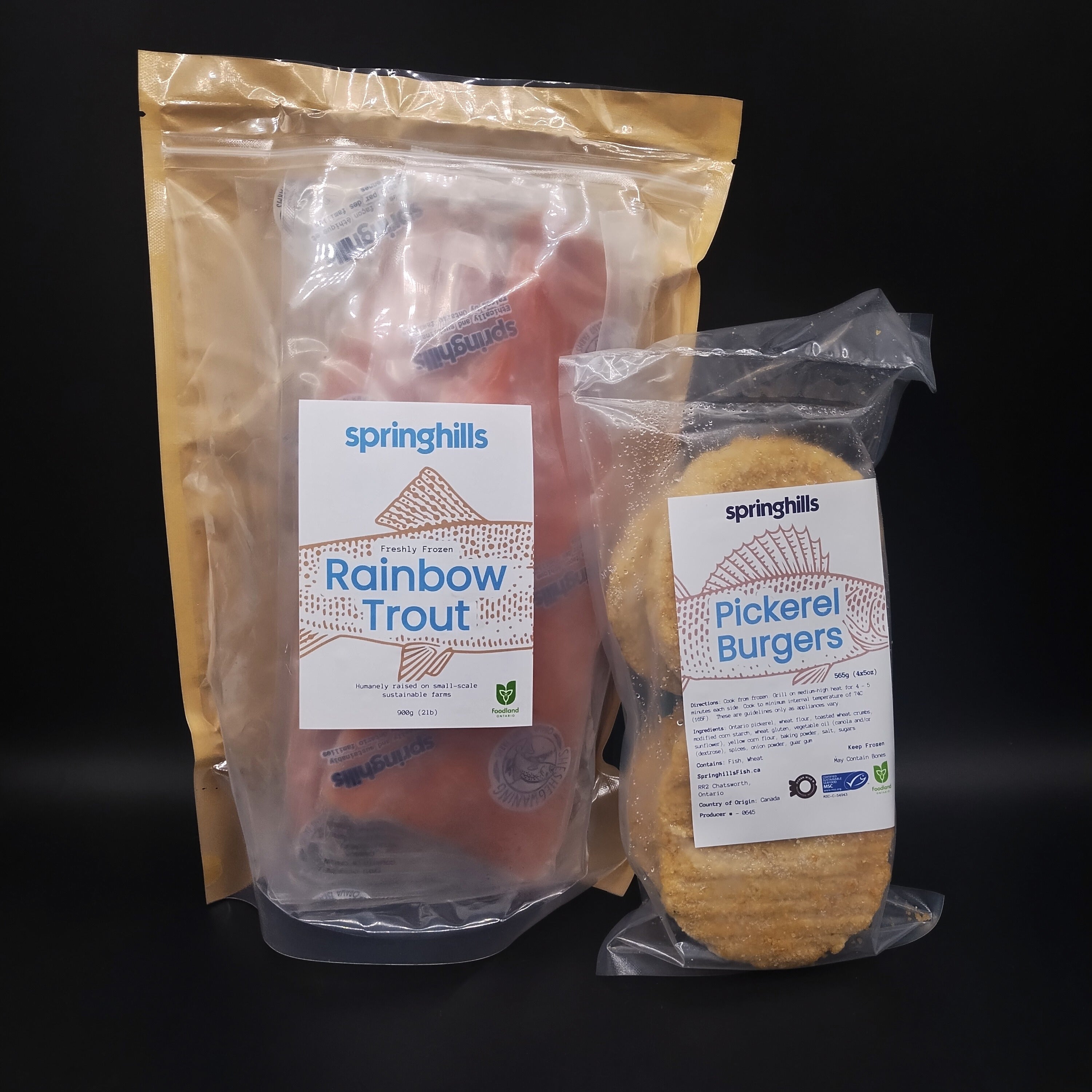 A light and summery bundle featuring responsibly raised fish from Springhills in Grey County. The unseasoned pickerel burgers are mild and flaky—perfect on a bun or bed of greens—while the rainbow trout fillets hold up beautifully on the grill or under the broiler. Great for a relaxed meal that doesn’t weigh you down.