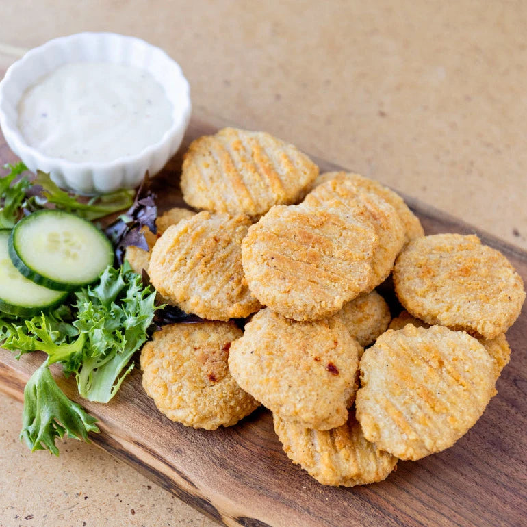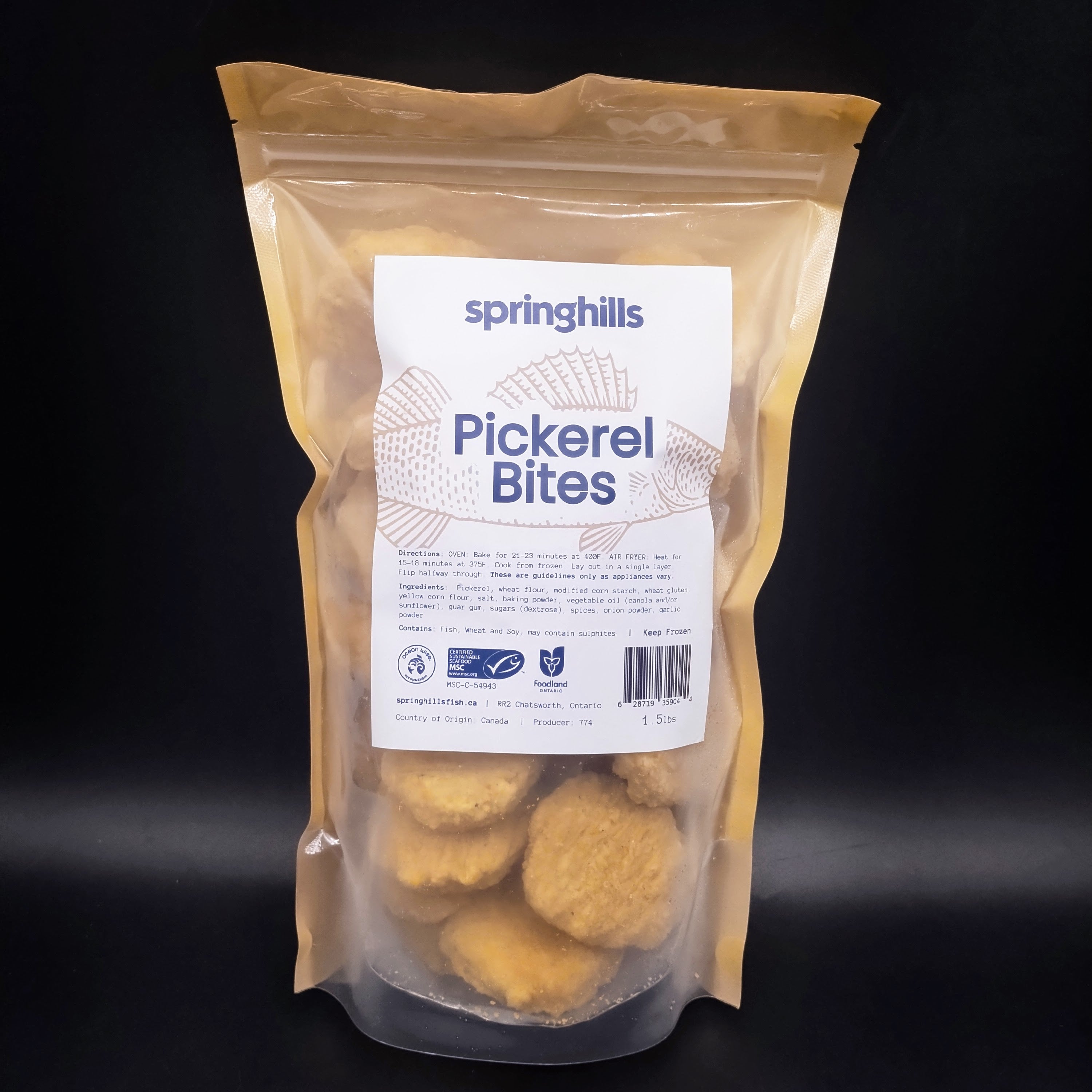 Taste: These  bite-sized pickerel bites are a delicious way to enjoy Ontario's most popular wild fish. Each bite is about 3cm across, and battered with a light seasoning.