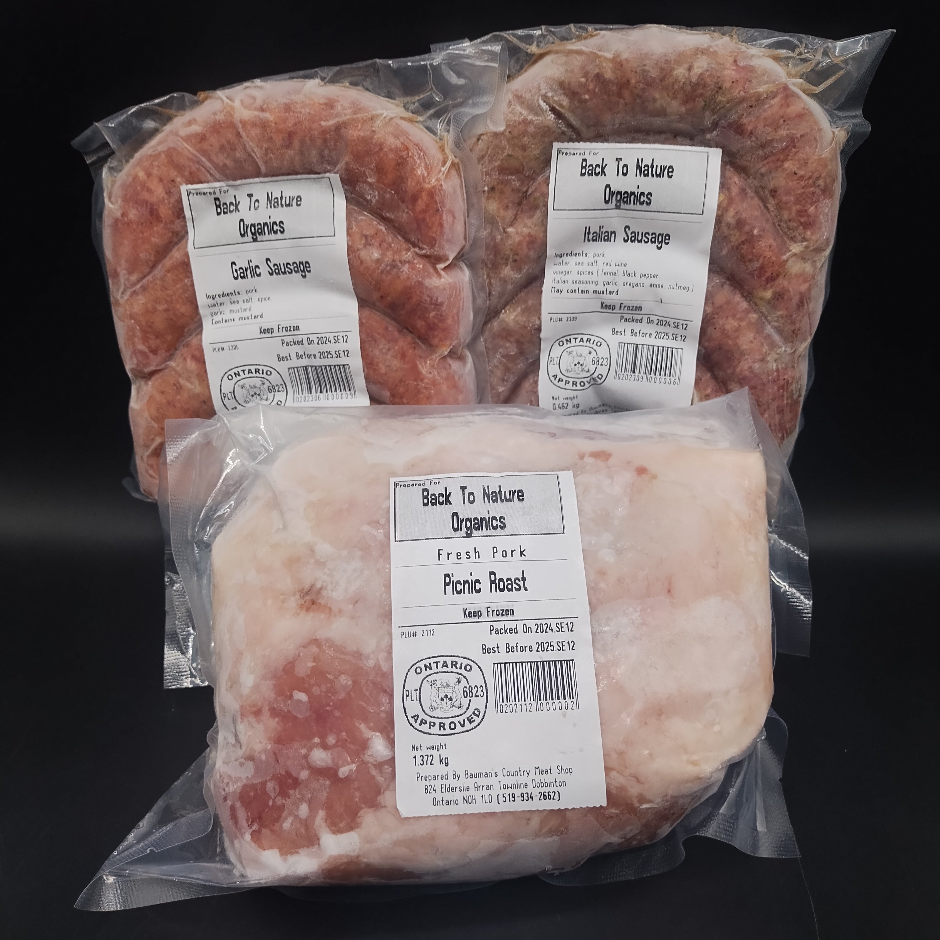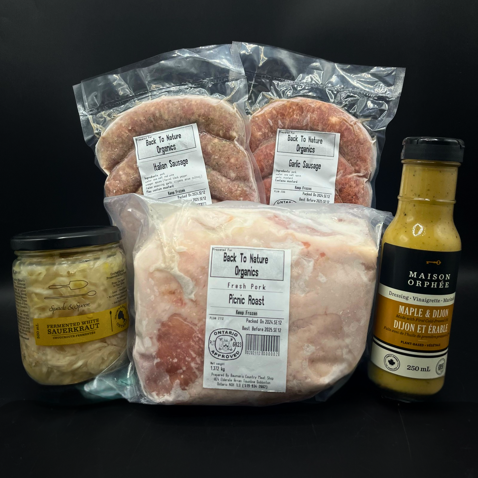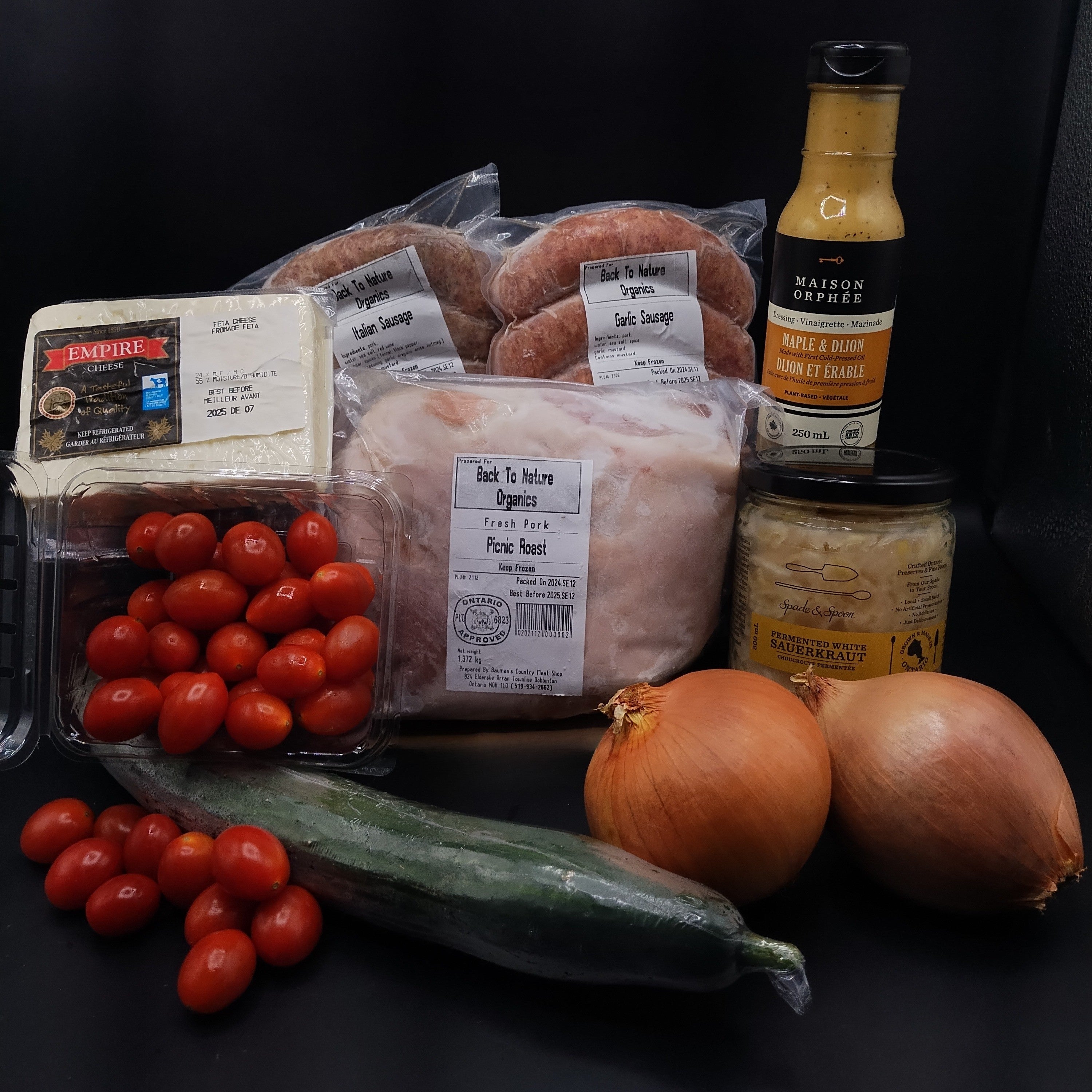 A grill-ready collection of succulent pasture-raised pork from Back-to-Nature Organics in Palmerston, ON—made for easy summer meals and relaxed get-togethers. The sausages go straight on the grill, while the pork picnic roast is perfect for low-and-slow cooking: roast it in the oven or throw it on the smoker for tender, pull-apart meat to feed a crowd. Choose the version that suits your gathering: