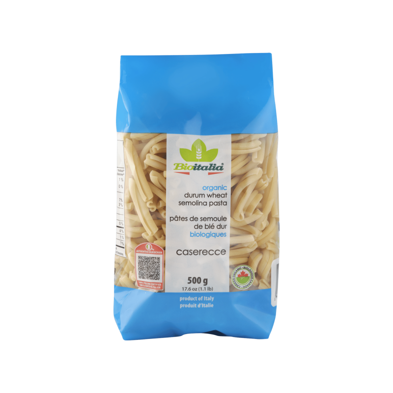 Caserecce made from Italian organic durum wheat, bronze-cut. The artisanal processing through bronze-cut techniques gives our caserecce a unique and porous texture. This traditional method allows the pasta to hold onto sauces optimally, ensuring an unforgettable taste experience.