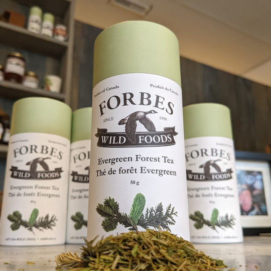 Our Evergreen Forest Tea is a lovely blend of balsam, eastern white cedar and spruce tips. The sweetness of the balsam combined with the citrusy spruce and rich cedar makes this blend particularly tasty. While some of the flavours may remind you of Christmas, this is an excellent blend to bring back memories of cottaging and camping.