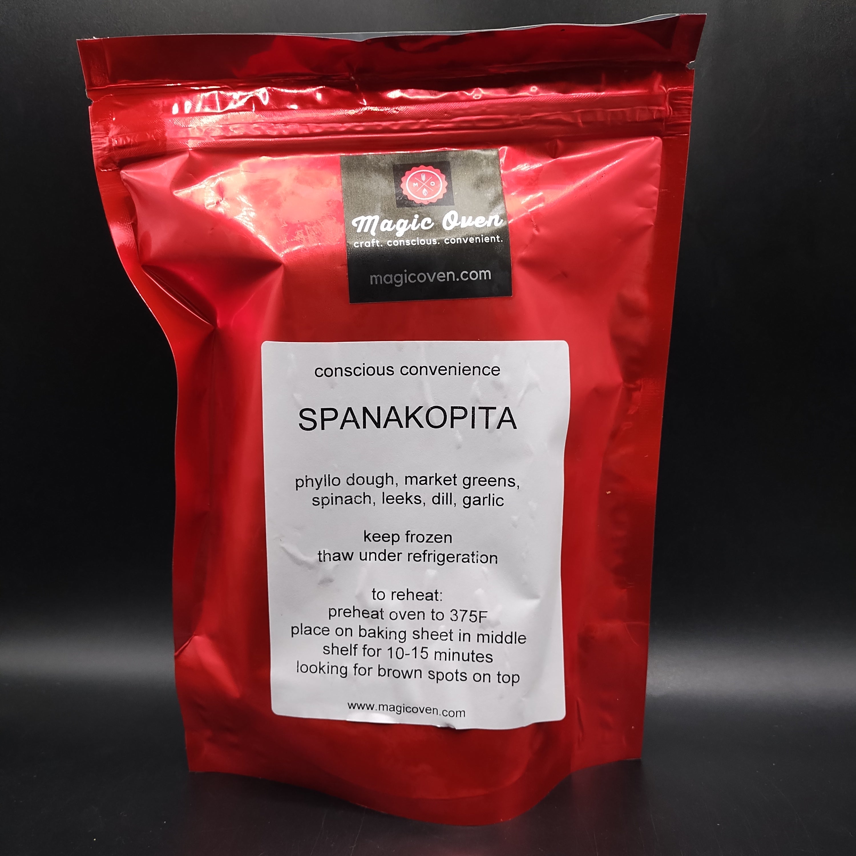 Magic Oven's spanakopita is fully cooked, but to reheat, bake on a tray at 375F, for 10-15 minutes, until the top of the pie browns.