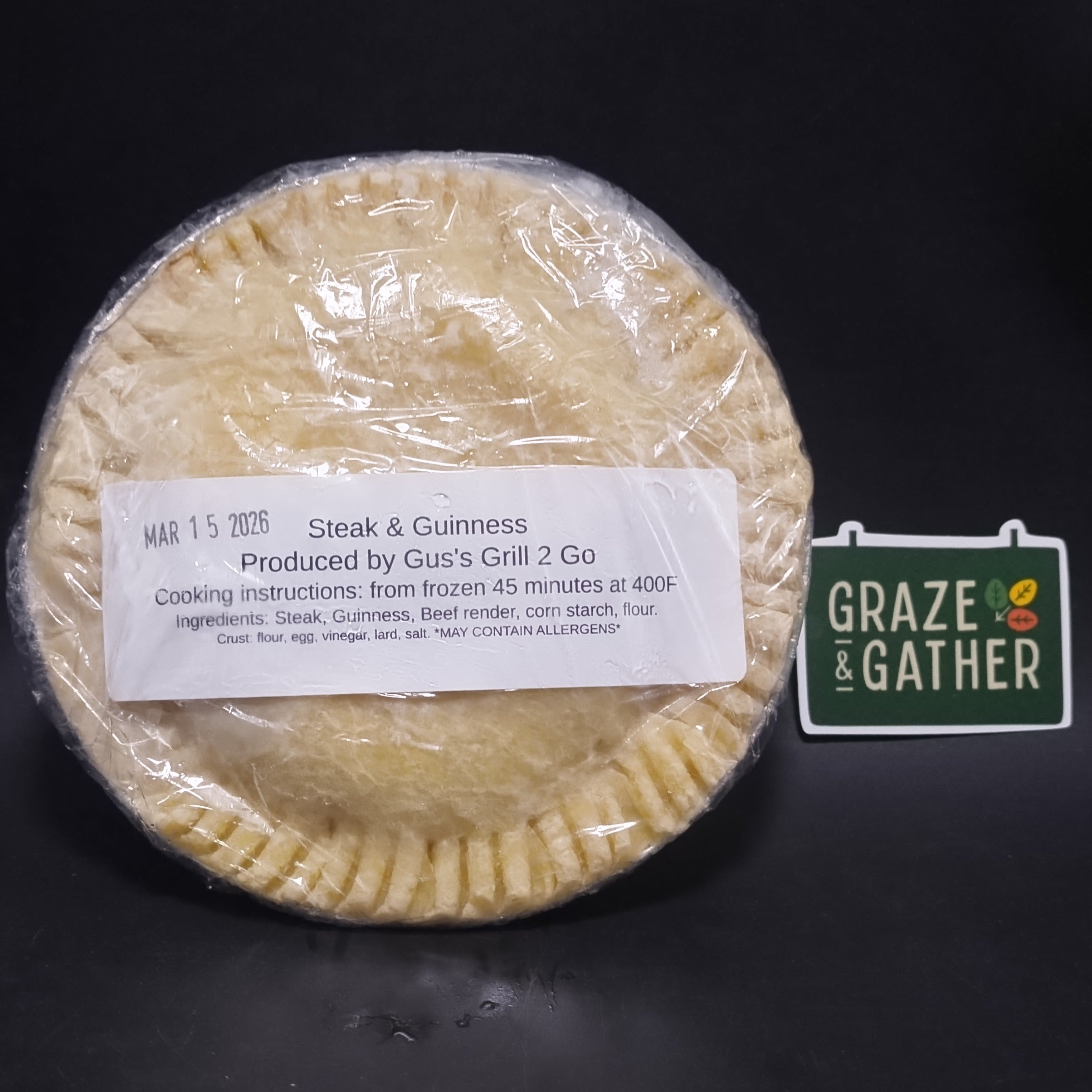 Ingredients: filling: steak, Guinness, beef render, cornstarch, flour.